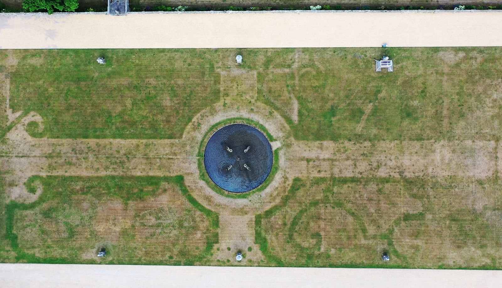 查茨沃斯庄园花园。来源:查茨沃斯庄园英国夏季的极端高温已经烧焦了英格兰中部一座历史悠久的住宅的南草坪,揭示了一个隐藏的17世纪花园。在德比郡的查茨沃斯庄园的草坪上可以看到宽阔、华丽的图案。