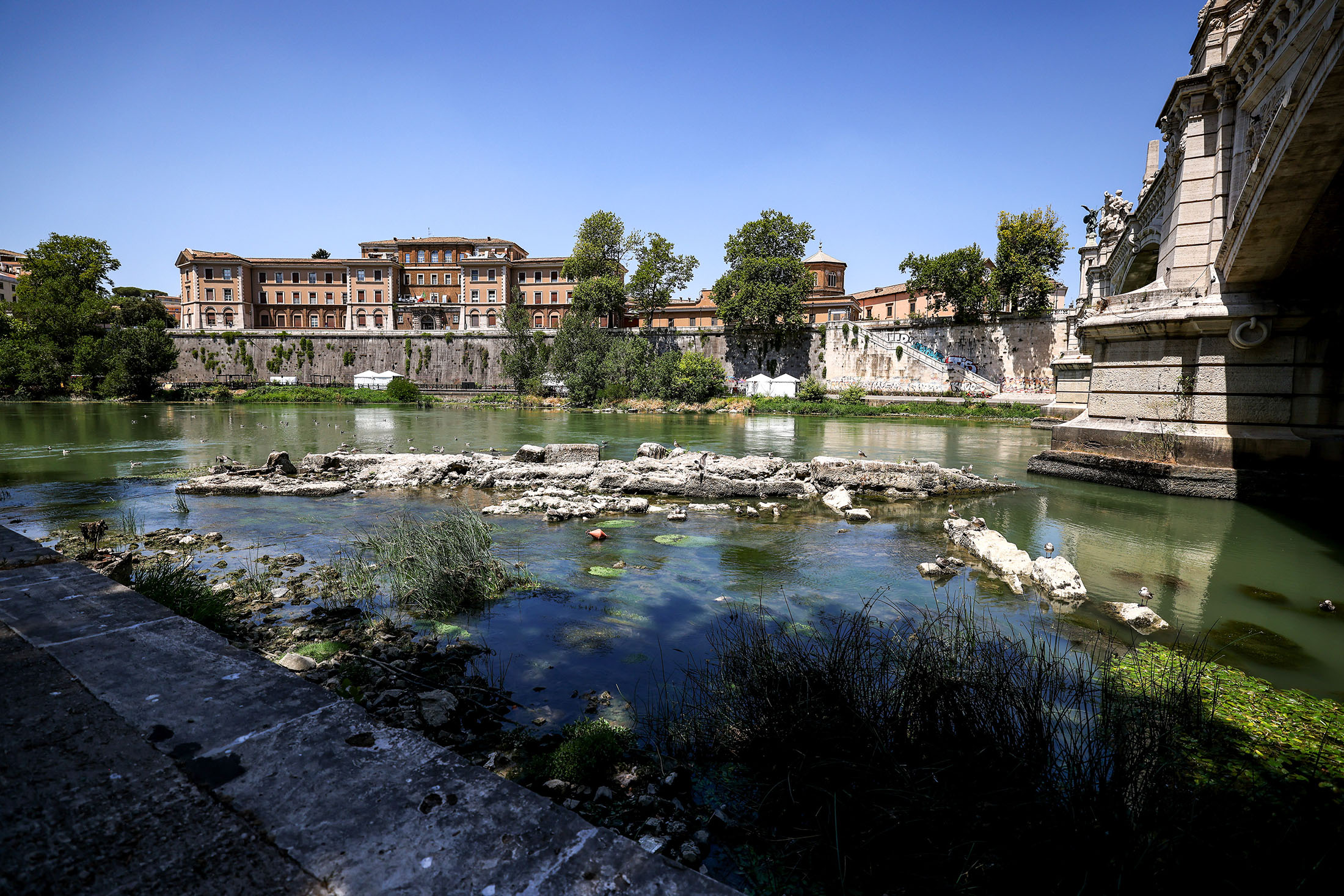 罗马的台伯河中一座桥的遗迹在七月浮出水面。摄影师:Alessia Pierdomenico/Bloomberg与此同时,在罗马,干旱使得台伯河水位下降,露出了一座据信建于尼禄皇帝统治时期的桥。今年夏天,意大利持续高温干燥的天气迫使政府在七月宣布了一场紧急状态。