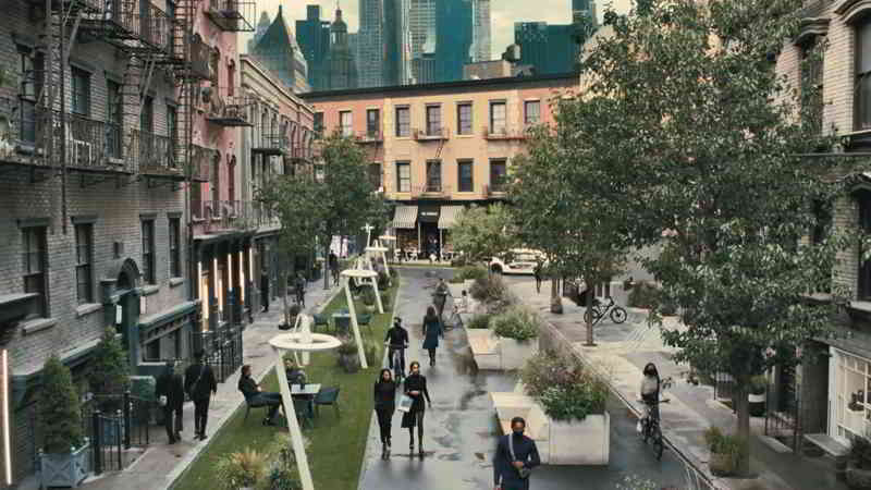 除了灯杆发出无调性声音以控制机器人用来奴役人类的寄生虫外,这个西区街景很宜人。照片由HBO提供但在机器人统治的未来纽约,并非一切都糟糕。天际线上遍布着新的摩天大楼,车辆交通似乎已被大规模驱逐,行人无论走到哪里都拥有通行权。一位主角(由伊万·瑞切尔·伍德饰演)漫步在一个西村的 woonerf,这个地方规模如此亲密,如此人性化和吸引人,以至于如果不是卡拉特拉的精神控制灯杆揭示了它是另一个机器人陷阱,它可能是简·雅各布斯设计的一场发热梦。