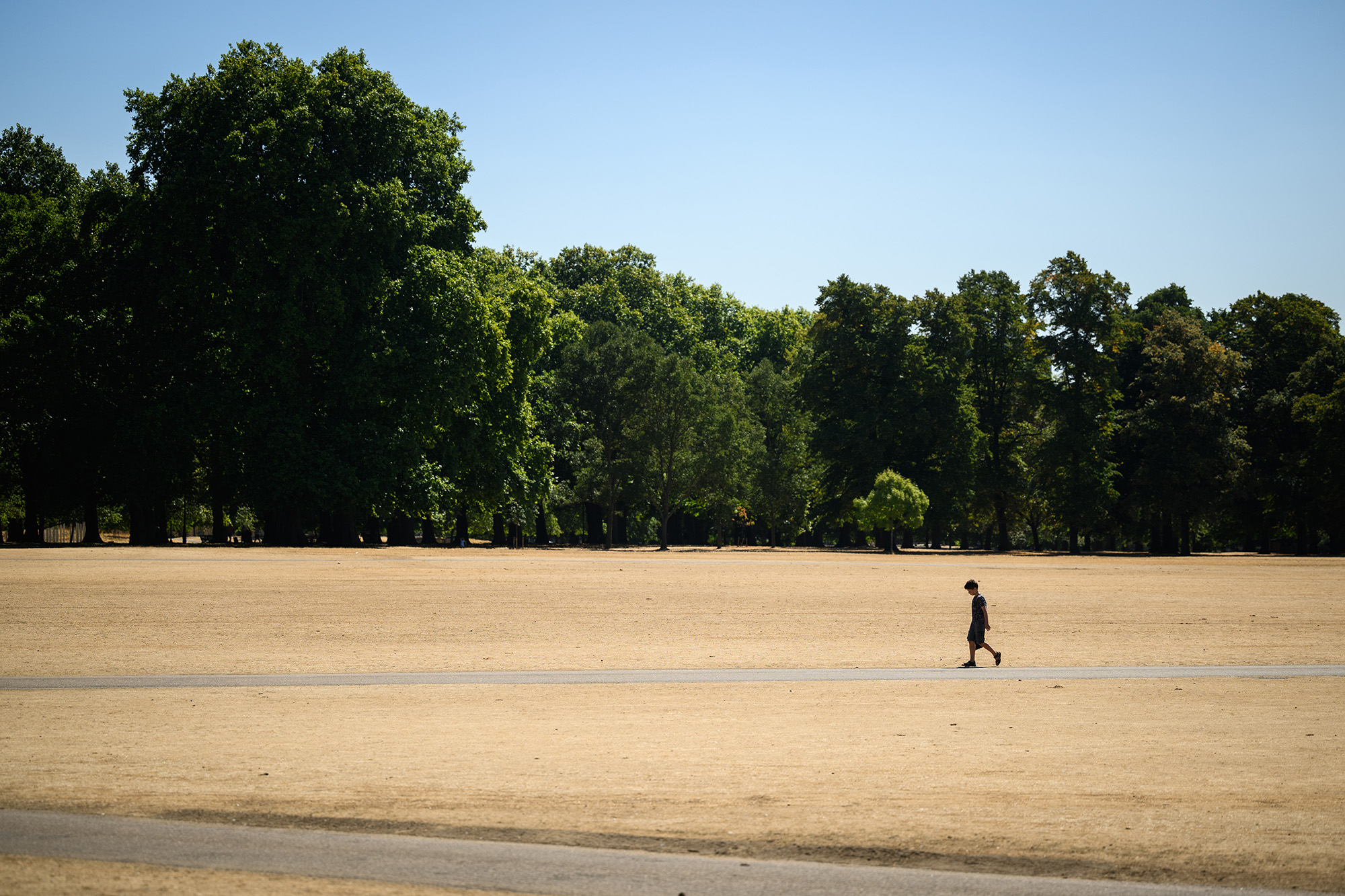 一个男孩在8月11日穿过海德公园的一个晒得发白的地区。