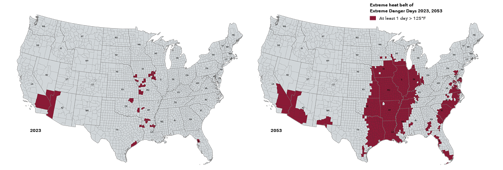 他们预测,在未来三十年,超过1亿美国人将生活在一个“极端高温带”中,每年至少有一天,热指数将超过125华氏度(52摄氏度) —— 美国国家气象局热指数的最高级别,即极端危险级别。(该指数结合了温度和湿度,得出你出门时的感觉。)
