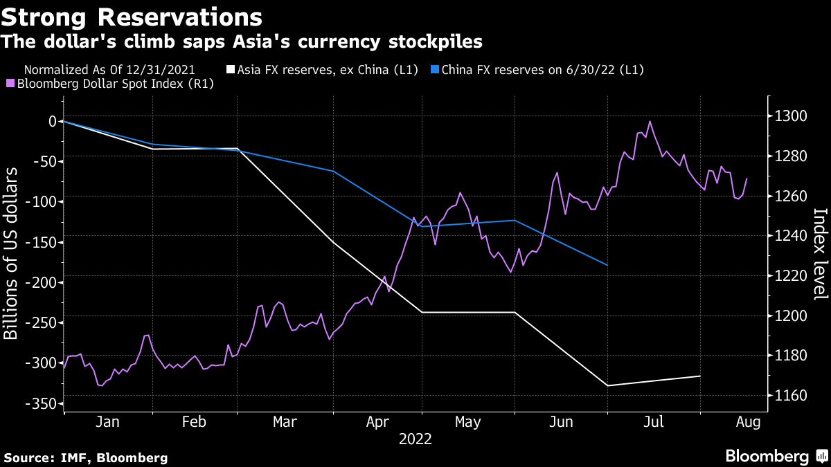 今年美元的强劲上涨伴随着亚洲央行外汇储备的减少。这是一件大事,因为该地区拥有全球一半以上的货币储备,包括七个最大的储备。