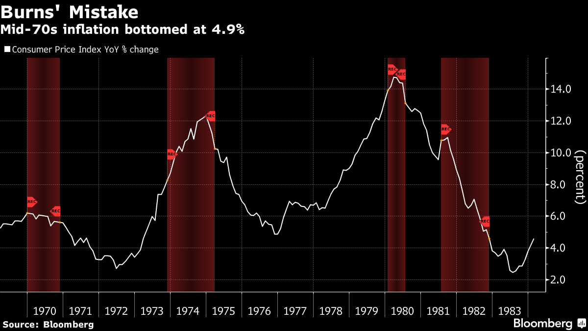 许多人将这一结果归咎于时任美联储主席亚瑟·伯恩斯。这也是鲍威尔应该晚上睡不好的原因。请记住,即使在伯恩斯任内股市表现良好(甚至在通胀调整后),高通胀意味着当美联储再次加息时股票和债券将面临清算。最终,劳动者、储蓄者和投资者都将受到损失。