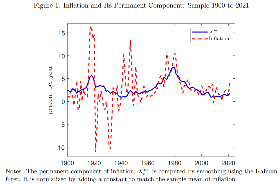 根据该模型,从2019年到2021年通货膨胀上升的277个基点中,除了51个基点外,其余都可以归因于“短期”因素。相比之下,战后模型显示238个基点是由更高的“永久性”通货膨胀引起的 — 这一结果受到了1960-80年代长期价格上涨的影响。