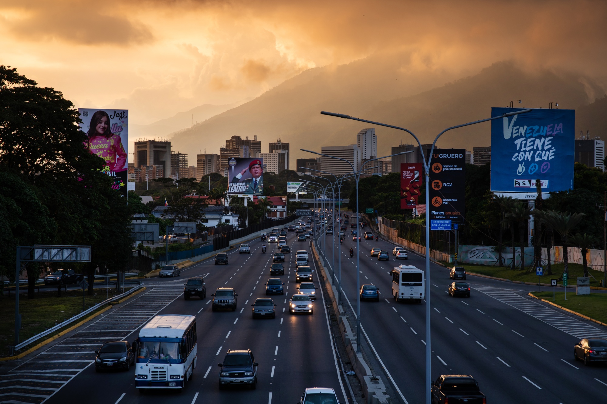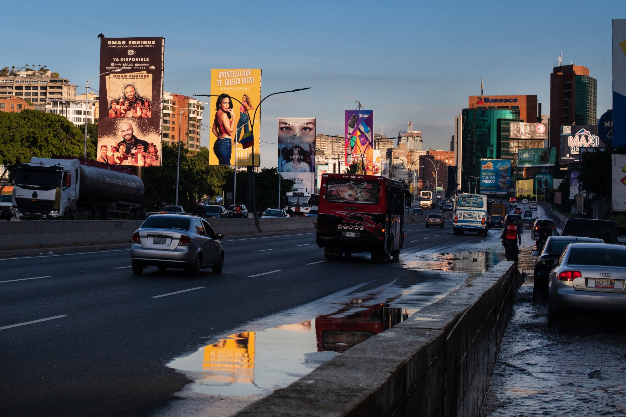 在加拉加斯的主要高速公路两旁,有音乐会、家电和打车应用的广告。摄影师:Gaby Oraa/Bloomberg