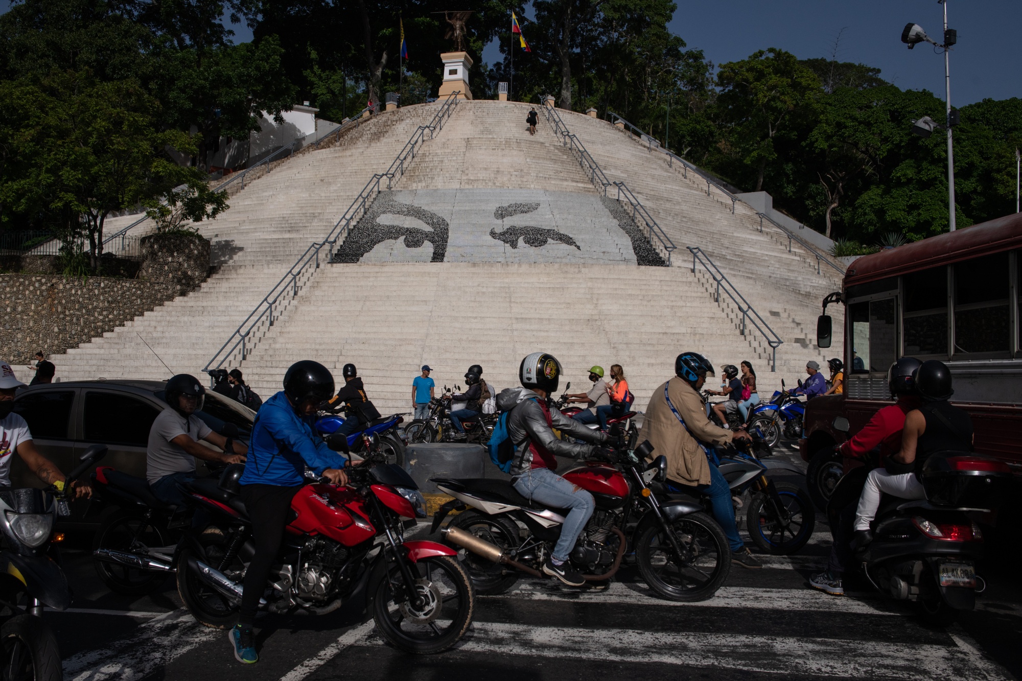 摩托车手驶过卡尔瓦里奥阶梯,查韦斯眼睛的形象俯视着。摄影师:加比·奥拉/彭博社