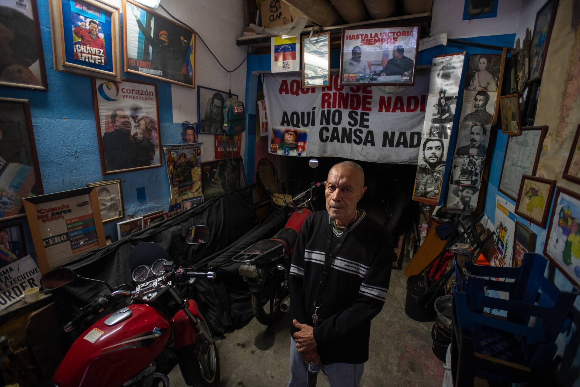 这位来自国家出版办公室的68岁退休人员梅萨曾在加拉加斯西部的卡蒂亚工人阶级社区附近组织基层政治会议。他试图在车库里恢复查韦斯的记忆,车库里摆满了过去25年收集的各种纪念品:玩偶、海报、报纸剪报。但他说,如今很少有人对这些会议或纪念品感兴趣。