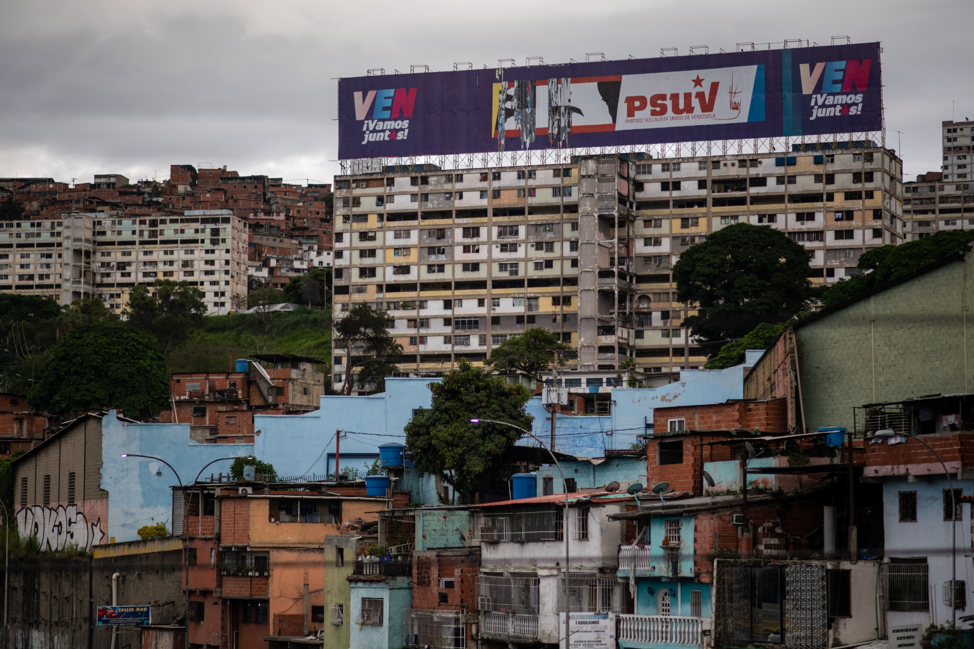 政府发布的广告牌与商业广告在委内瑞拉加拉加斯的主要动脉上竞争。
