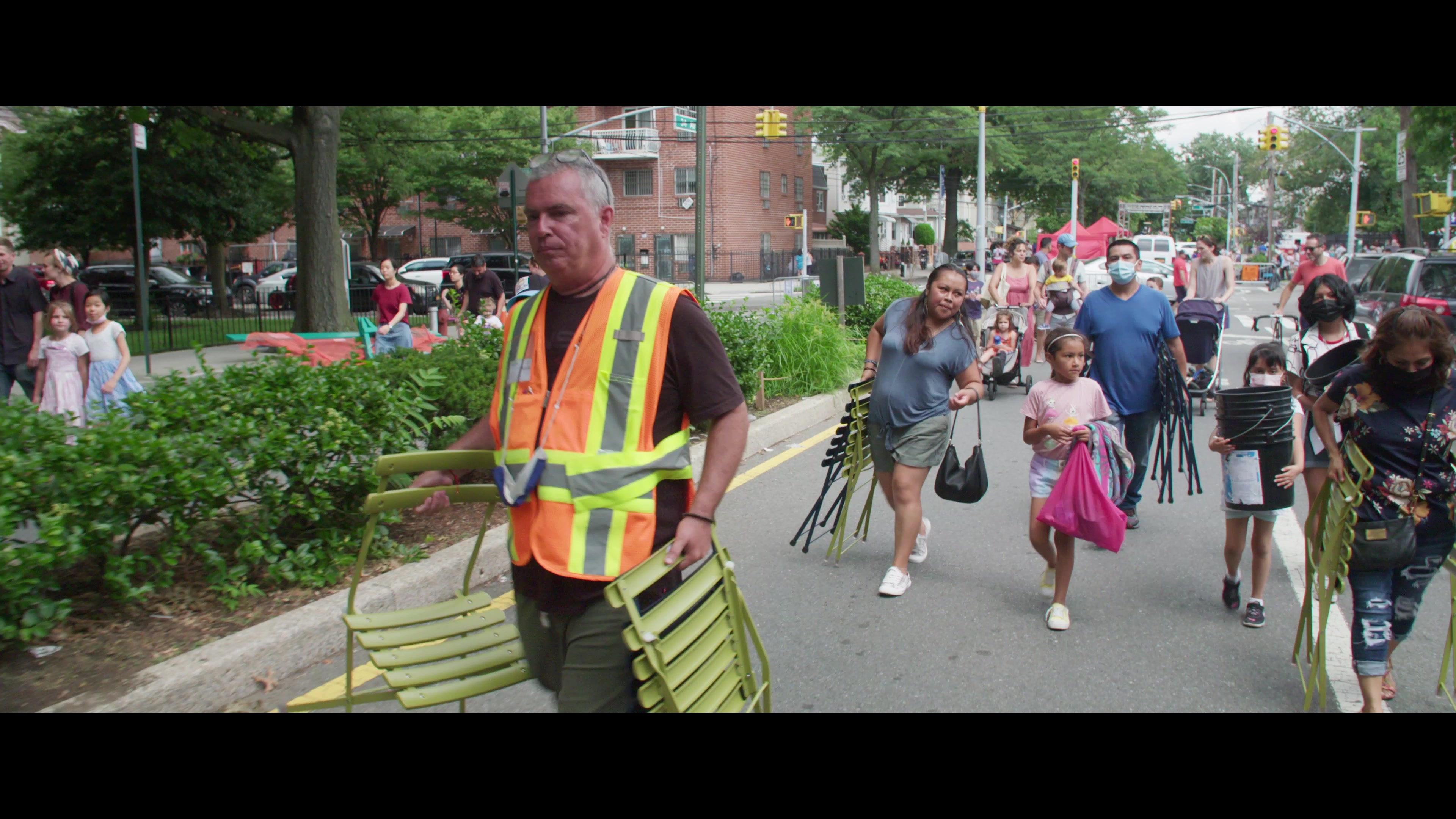 志愿者们在纽约市第34大道开放街道上摆放折叠椅。图片由Boyd Productions提供“需求是存在的,但疫情帮助推动了对它的渴望,人们也有了时间,”在影片中,曾被肇事逃逸的杜尔西·坎顿(Dulcie Canton)说道,她在纽约市成为了自行车活动家。坎顿是几位当地志愿者之一,他们齐心协力,整合资源和精力,将这条大道变成了一个游乐和庆祝的场所。