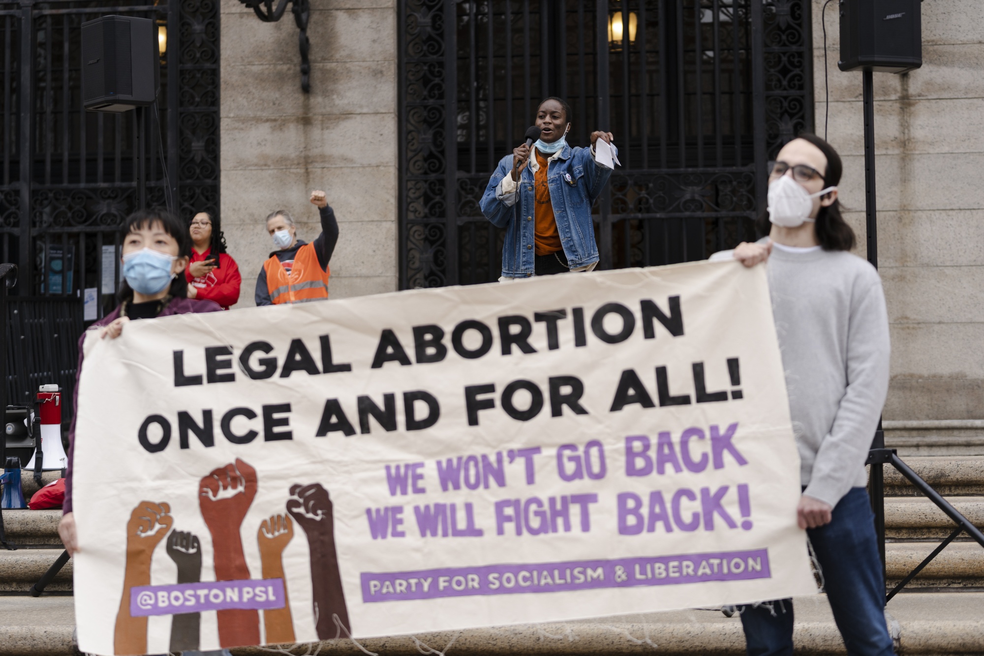 堕胎权利示威者在2022年5月6日的波士顿集会上举着标语。