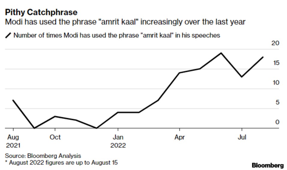 根据彭博新闻对过去12个月数十次演讲的分析,这是今年迄今为止单日使用次数最多的,显示出莫迪在政府承受压力时会频繁使用“甘露时代”这个词。