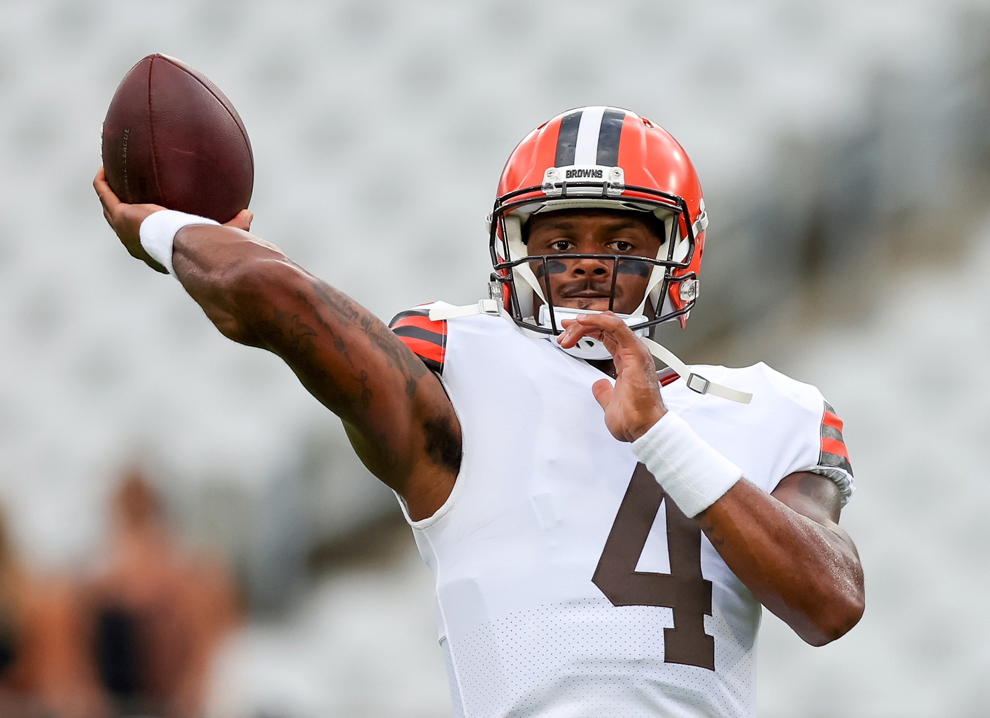 克利夫兰棕榈队的德肖恩·沃森在2022年8月12日在佛罗里达州杰克逊维尔比赛前热身。摄影师:迈克·卡尔森/盖蒂图片社