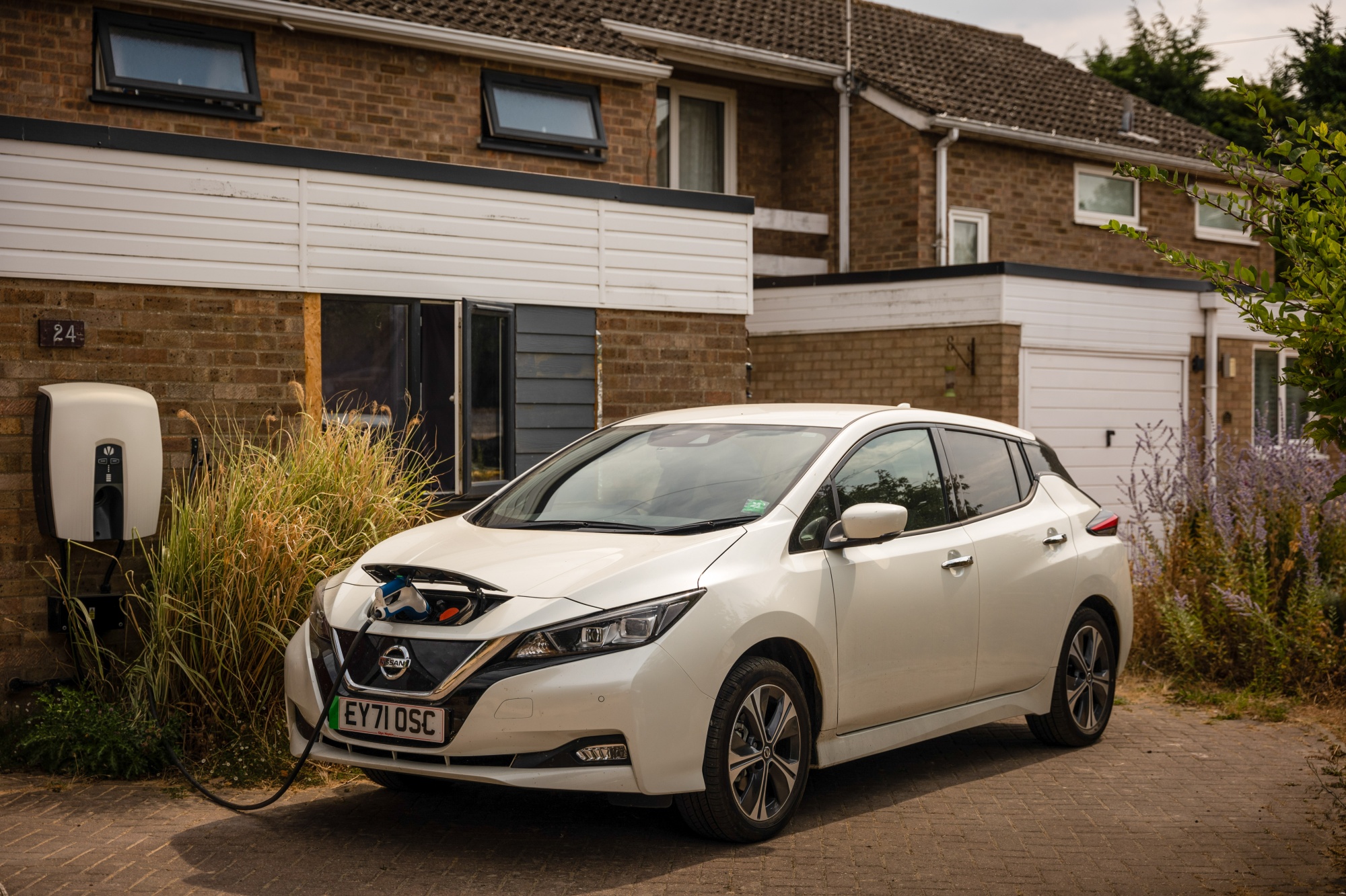 保罗·克尔肖(Paul Kershaw)的日产叶电动汽车在他位于英国剑桥附近的家外充电,时间是8月15日。