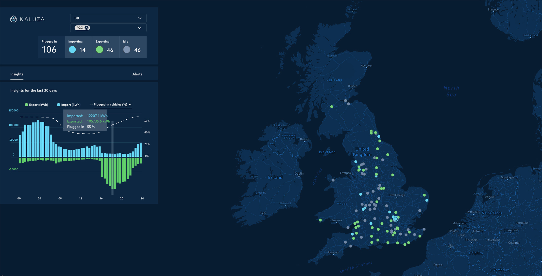 在伦敦的Kaluza神经中心,公司的客户解决方案负责人Conor Maher-McWilliams在地图上监控英国的350辆支持电网的车辆,就像在一个电子战场中监视士兵一样。每辆车都是一个点,随着一天的进展,它们从蓝色(充电)过渡到灰色(空闲),最终在晚上变成绿色,将电力输送回电网。