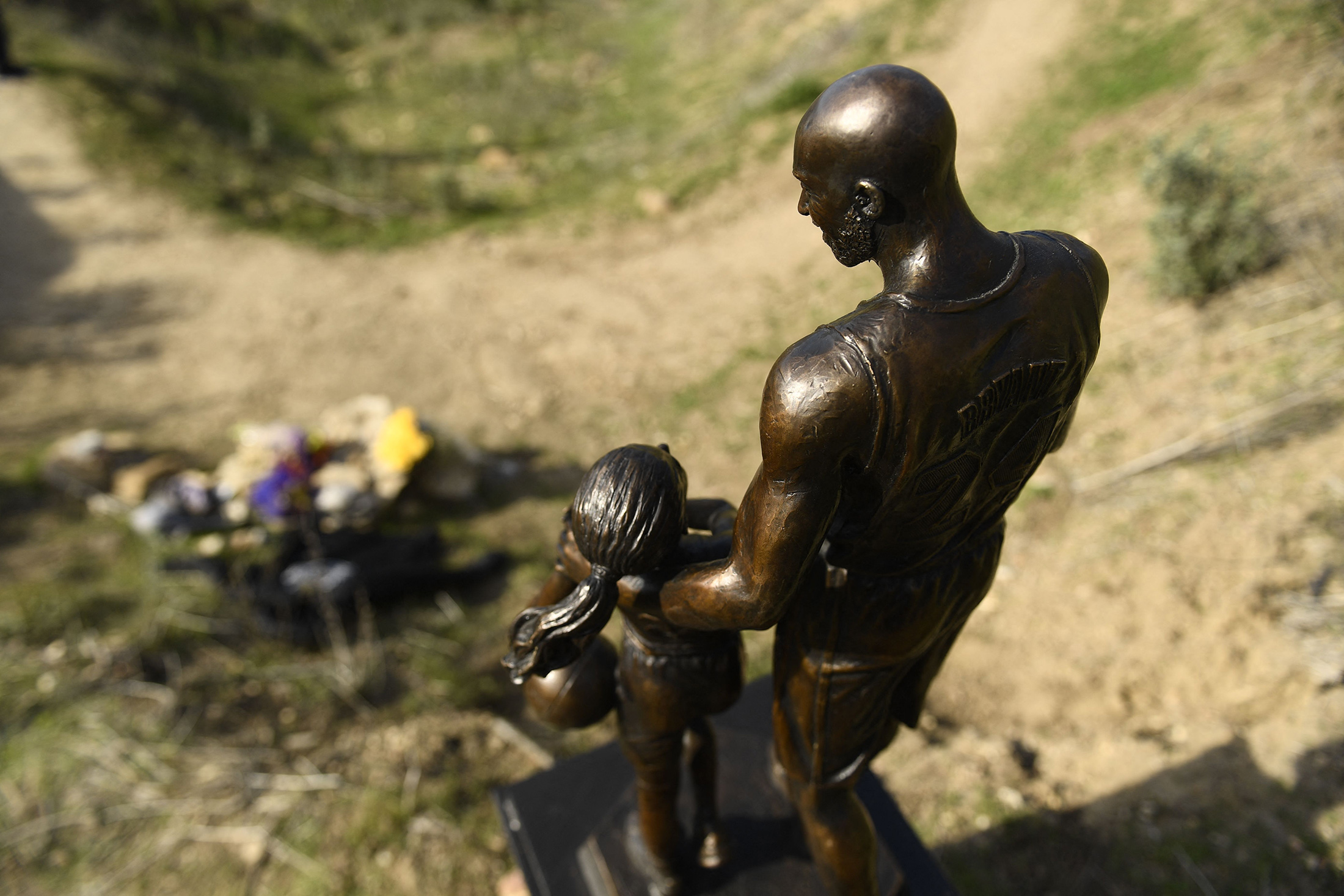 一座青铜雕塑描绘了科比·布莱恩特、女儿吉安娜·布莱恩特以及那些遇难者的名字,被展示在加利福尼亚卡拉巴萨斯市一处2020年直升机坠毁事故现场,作为一天的临时纪念。