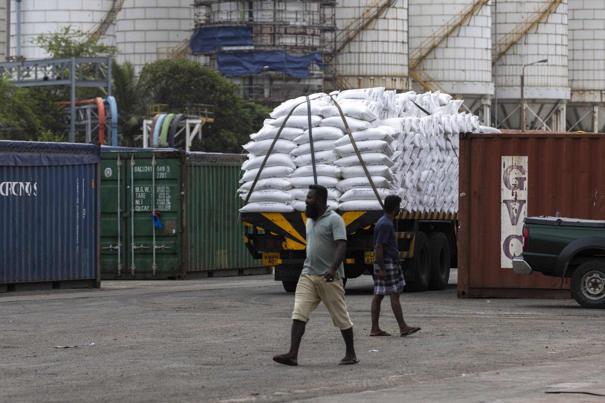 工人们走过科伦坡港口运输肥料袋的卡车。