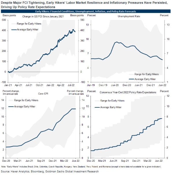 高盛研究了九个国家,它们是最早收紧政策的国家,主要是拉丁美洲和中东欧的新兴市场,以及新西兰。