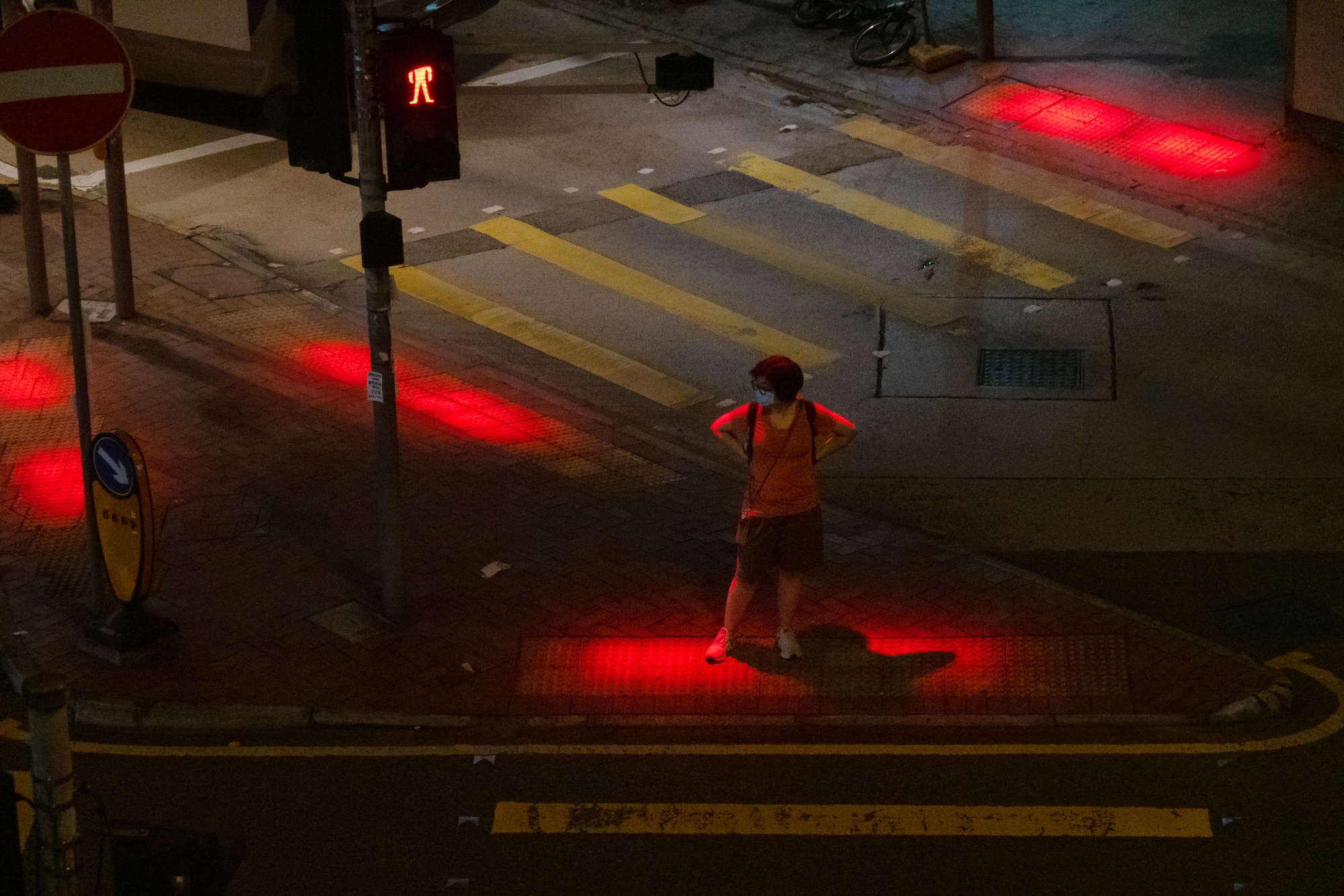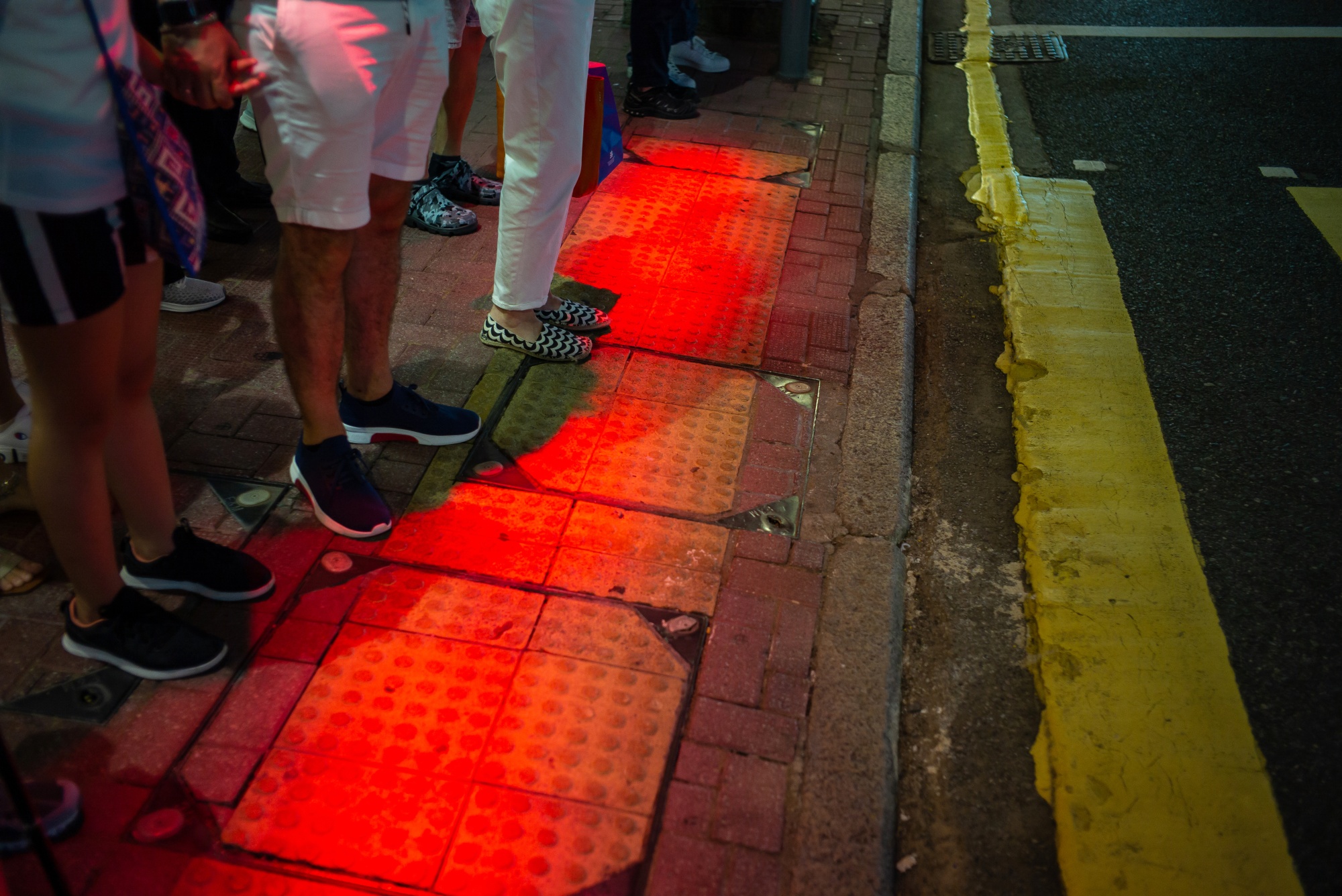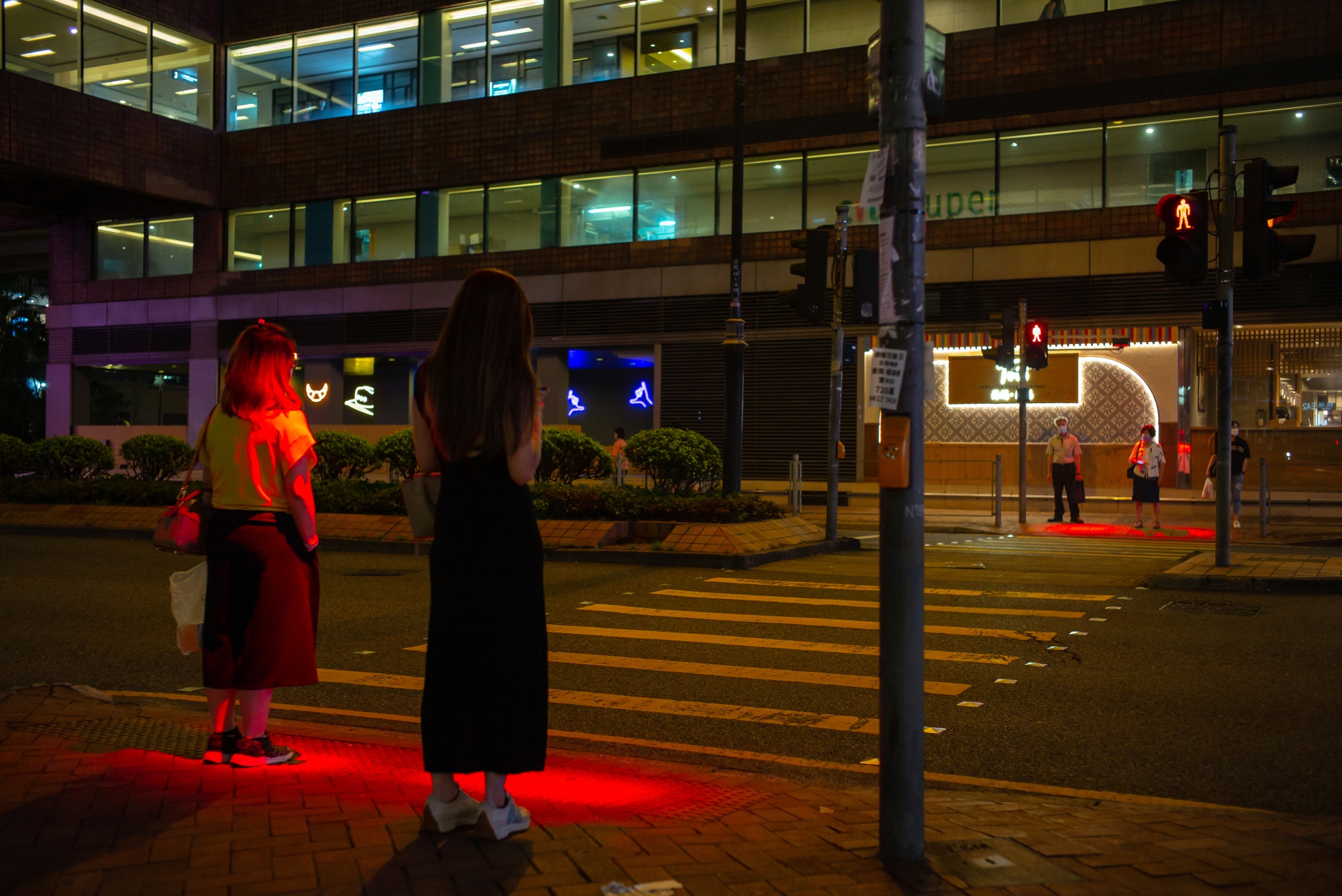 LED灯照亮了香港的一个过街口,旨在提醒行人停下来。