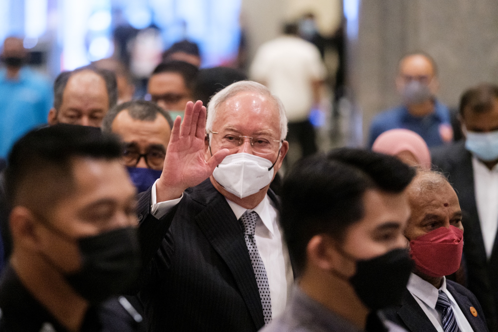 纳吉布·拉扎克(Najib Razak)在8月23日抵达马来西亚上诉法院和联邦法院时挥手。