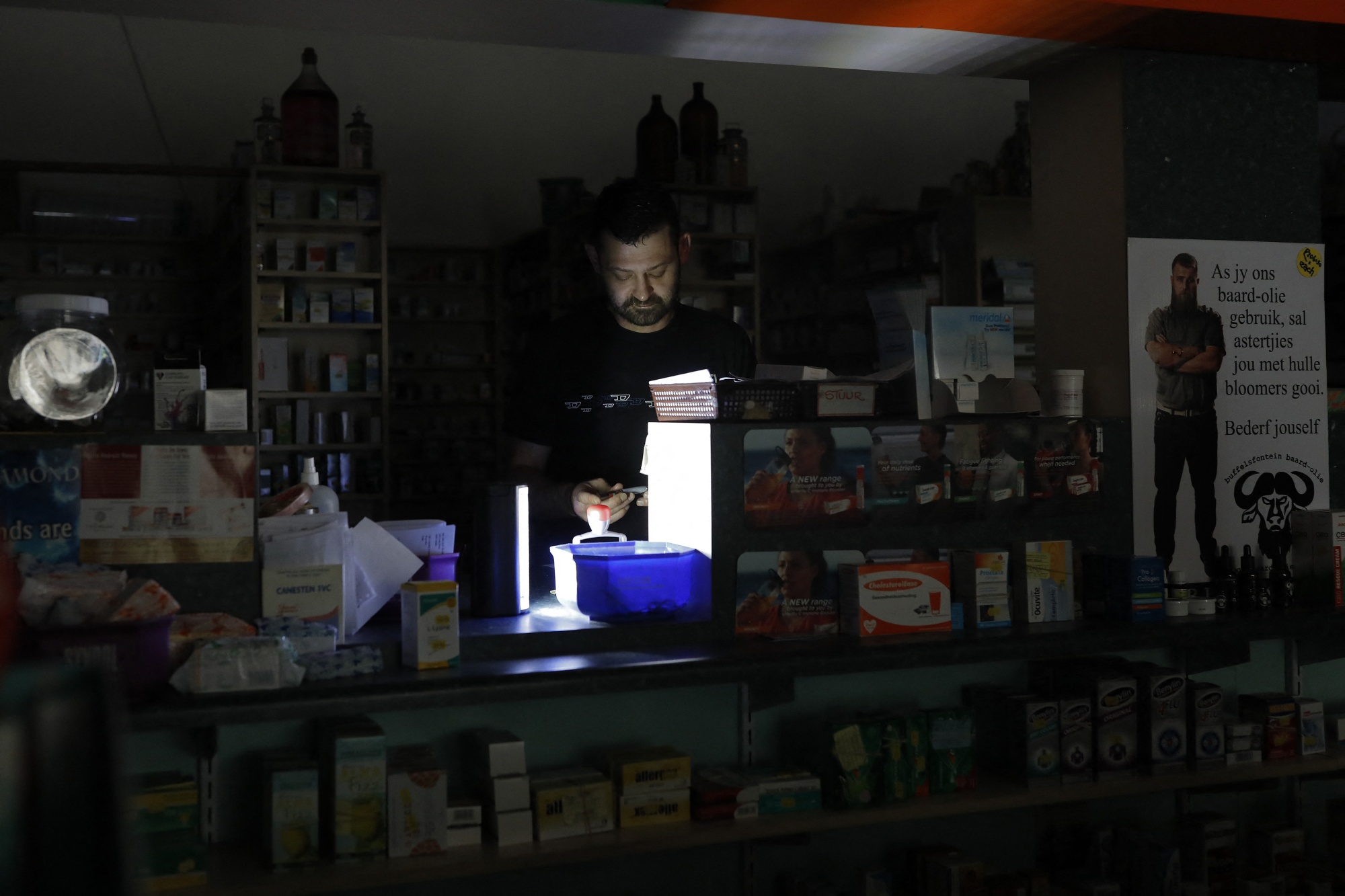 一名工人在南非比勒陀利亚Sinnoville Centre的一家药店内使用可充电LED灯照明时,看着自己的手机,该药店的电力供应被比勒陀利亚市政府切断,时间是在二月。