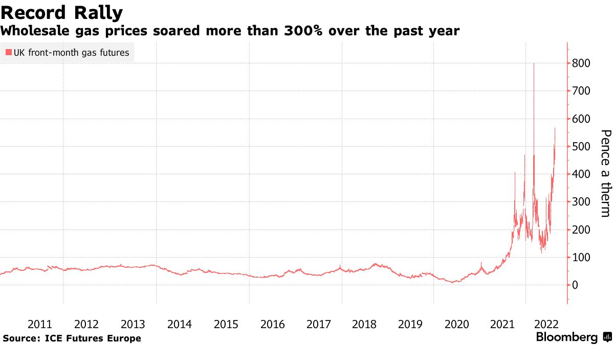 英国批发天然气和电力价格接近创纪录水平,目前天然气期货价格是正常水平的10倍。俄罗斯切断对欧洲大陆的供应以及对本冬季短缺的担忧使市场动荡不安。