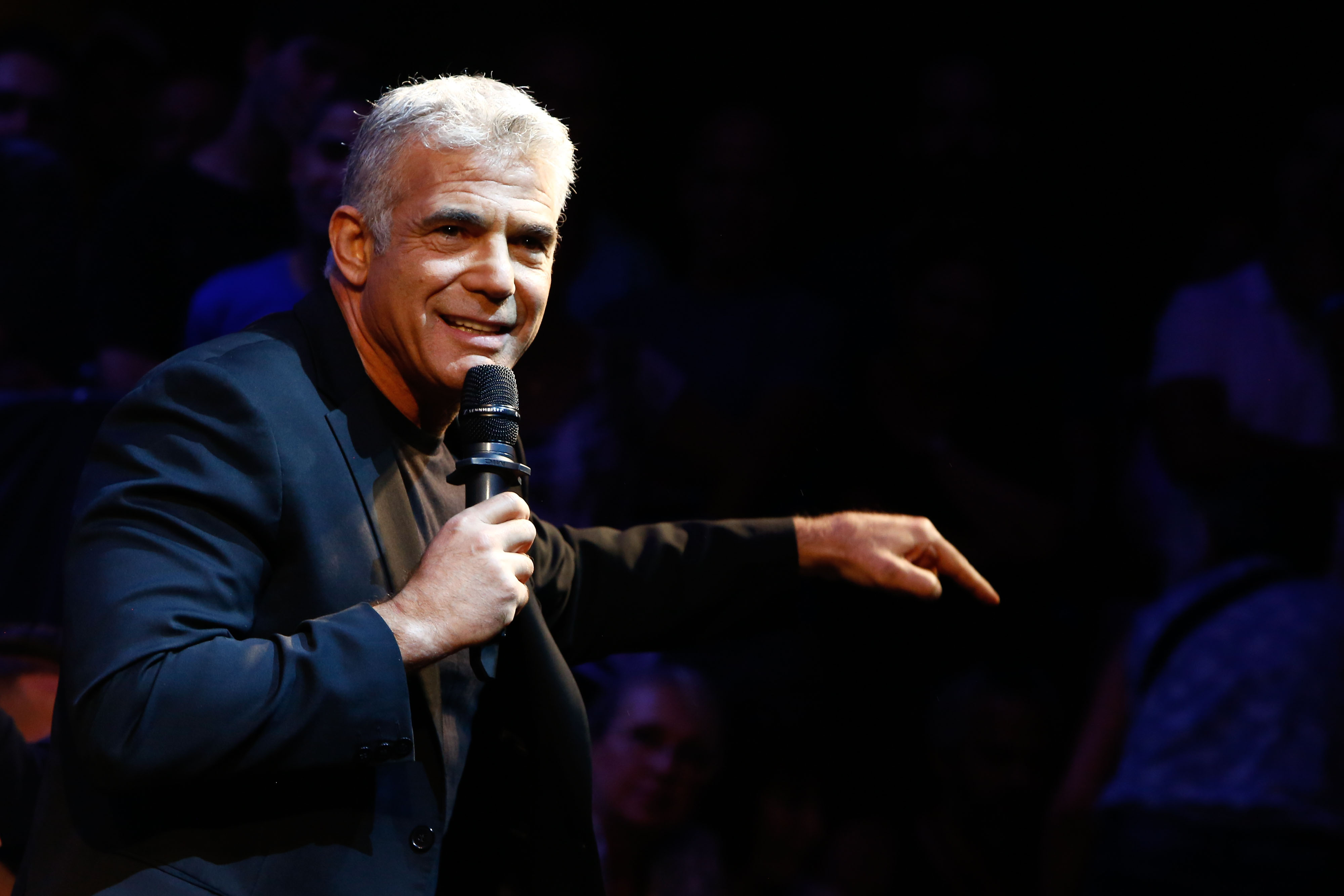 雅伊尔·拉皮德(Yair Lapid),耶什·阿蒂德(Yesh Atid)党主席,在以色列特拉维夫举行的选举前最后一次竞选活动中向观众做手势,时间为2019年9月15日星期日。以色列9月17日选举前的民意调查显示,现任总理本雅明·内塔尼亚胡(Benjamin Netanyahu)的利库德党和前军事首领本尼·甘茨(Benny Gantz)的蓝白党之间竞争激烈。摄影师:科比·沃尔夫/Bloomberg