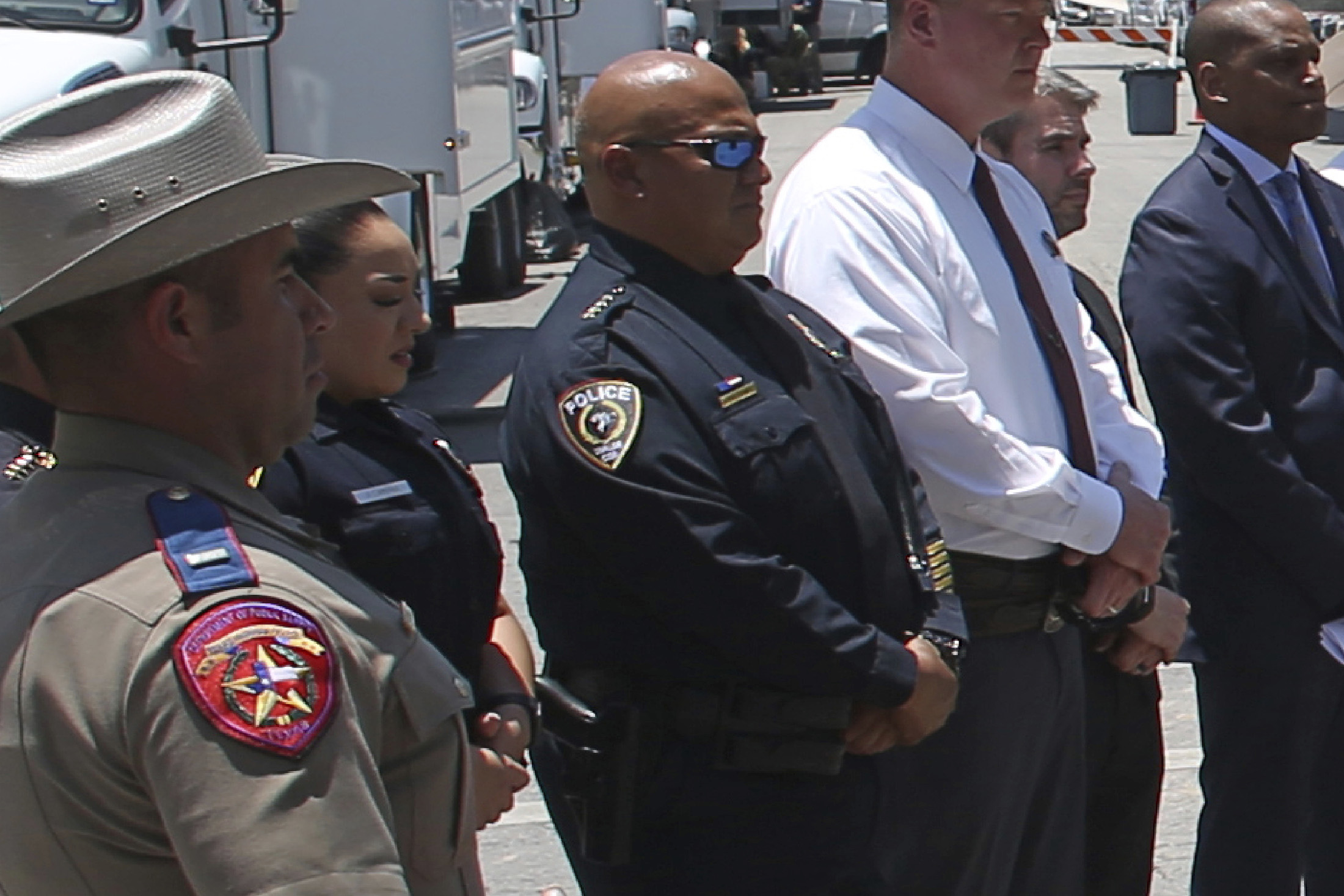 警察局长皮特·阿雷东多(Pete Arredondo),中间,于5月26日在德克萨斯州乌瓦尔迪(Uvalde)的罗布小学外举行新闻发布会。