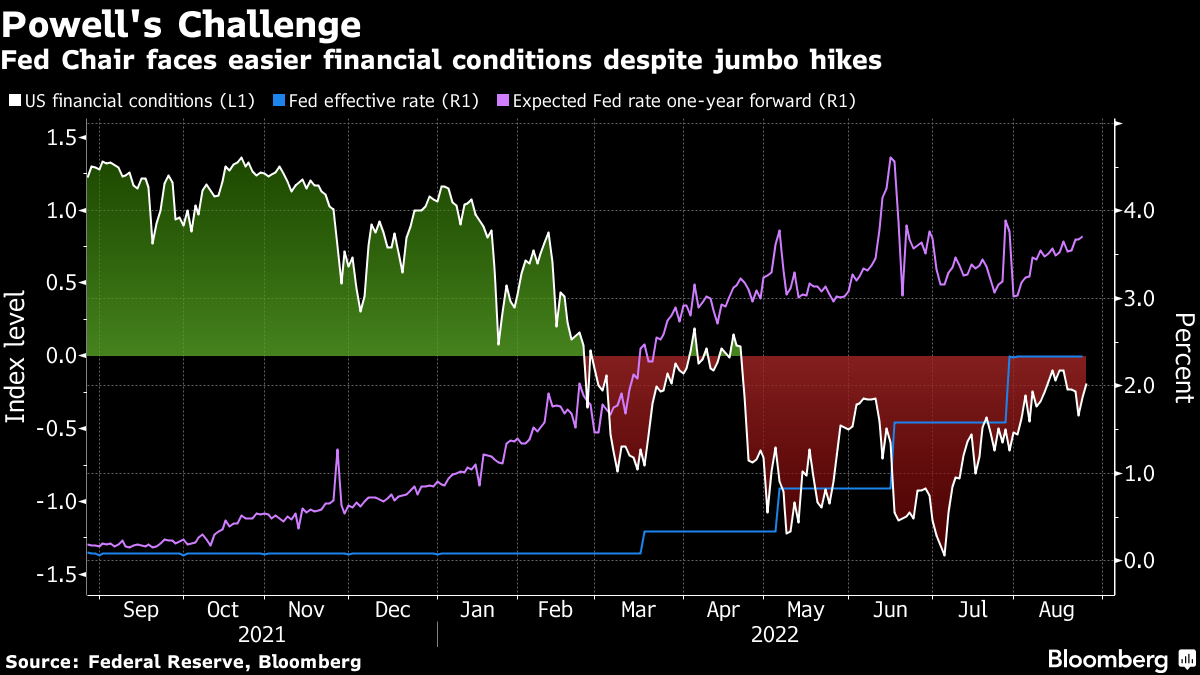 美联储主席杰罗姆·鲍威尔可能会在周五上午在杰克逊霍尔发表讲话,开启中央银行年度研讨会时,很难满足他将坚持鹰派政策立场的预期。有人认为他需要超调,因为市场继续通过阻碍中央银行实施有史以来最大规模的利率上调来“与美联储作对”。