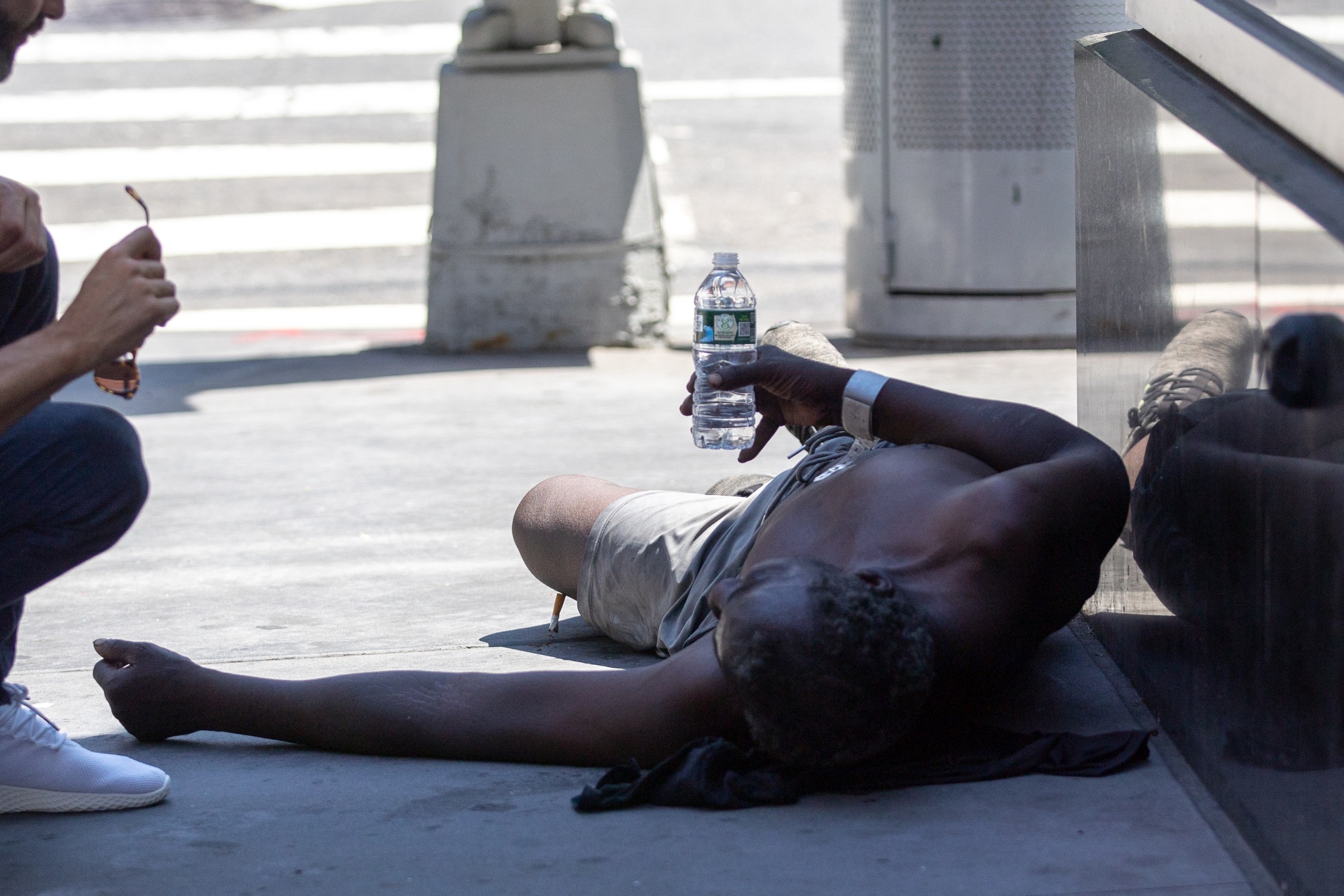 一个人躺在纽约时代广场附近的街道上,当时是2021年6月30日,美国正值一场热浪中。