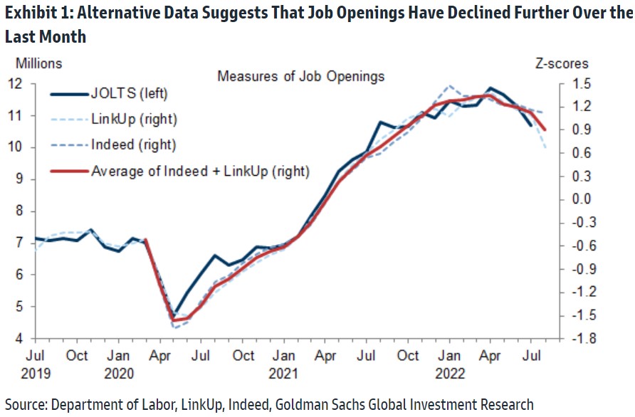 职位空缺在将近半年前达到峰值,自那时以来已经减少了至少110万个,但它们仍然保持在接近纪录水平,高盛分析师罗尼·沃克本周在一份报告中写道。