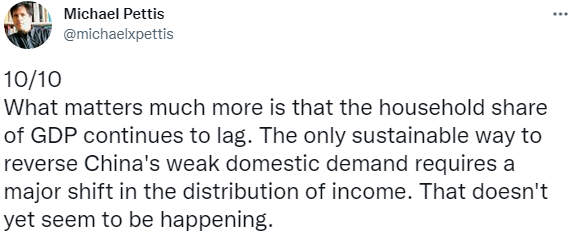 所有这些一流的基础设施有助于扩大经济的生产能力,巩固中国作为世界工厂的地位,并推动其创纪录的贸易顺差。这种供给侧重心态的缺点是消费需求仍然不足,正如经济学家们一直指出的那样,例如 迈克尔·佩蒂斯,这种不平衡并没有得到改善。