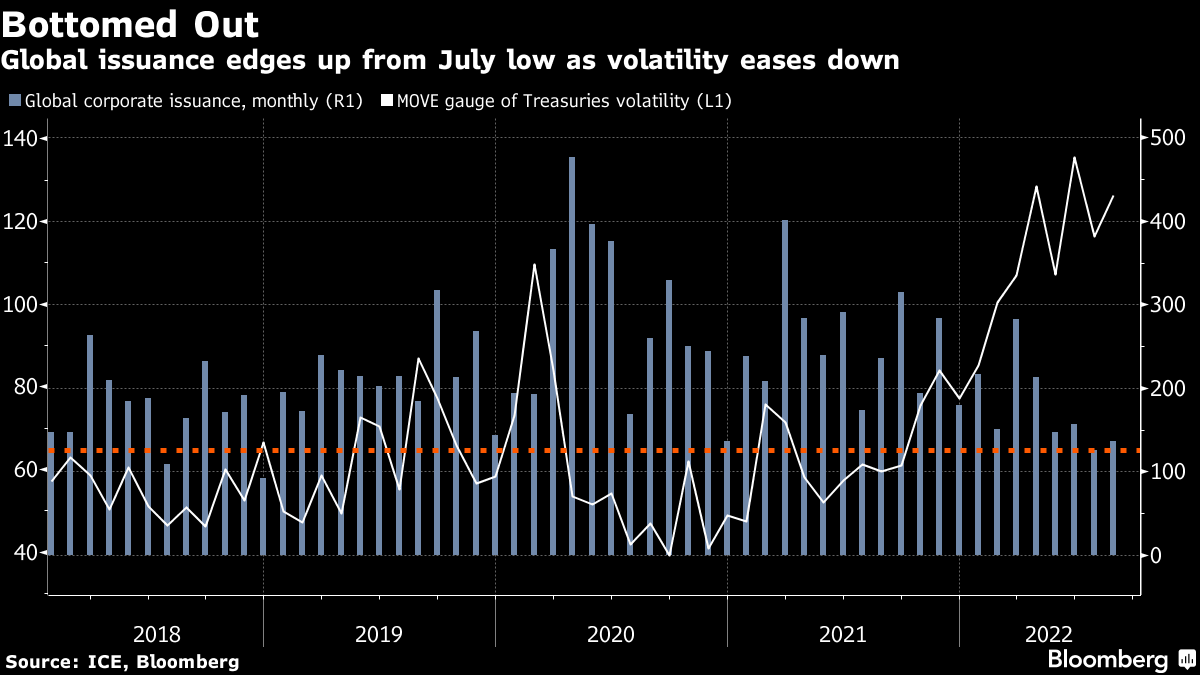 必需品绝对是欧洲发行的动力,那里的公用事业公司正引领着这场为冬季能源危机做准备的浪潮。至于融资创新,不用看得太远,全球银行被困在价值80亿美元的不受欢迎的并购融资债务中 — 他们正忙着将其切割并进行调整以寻找买家。