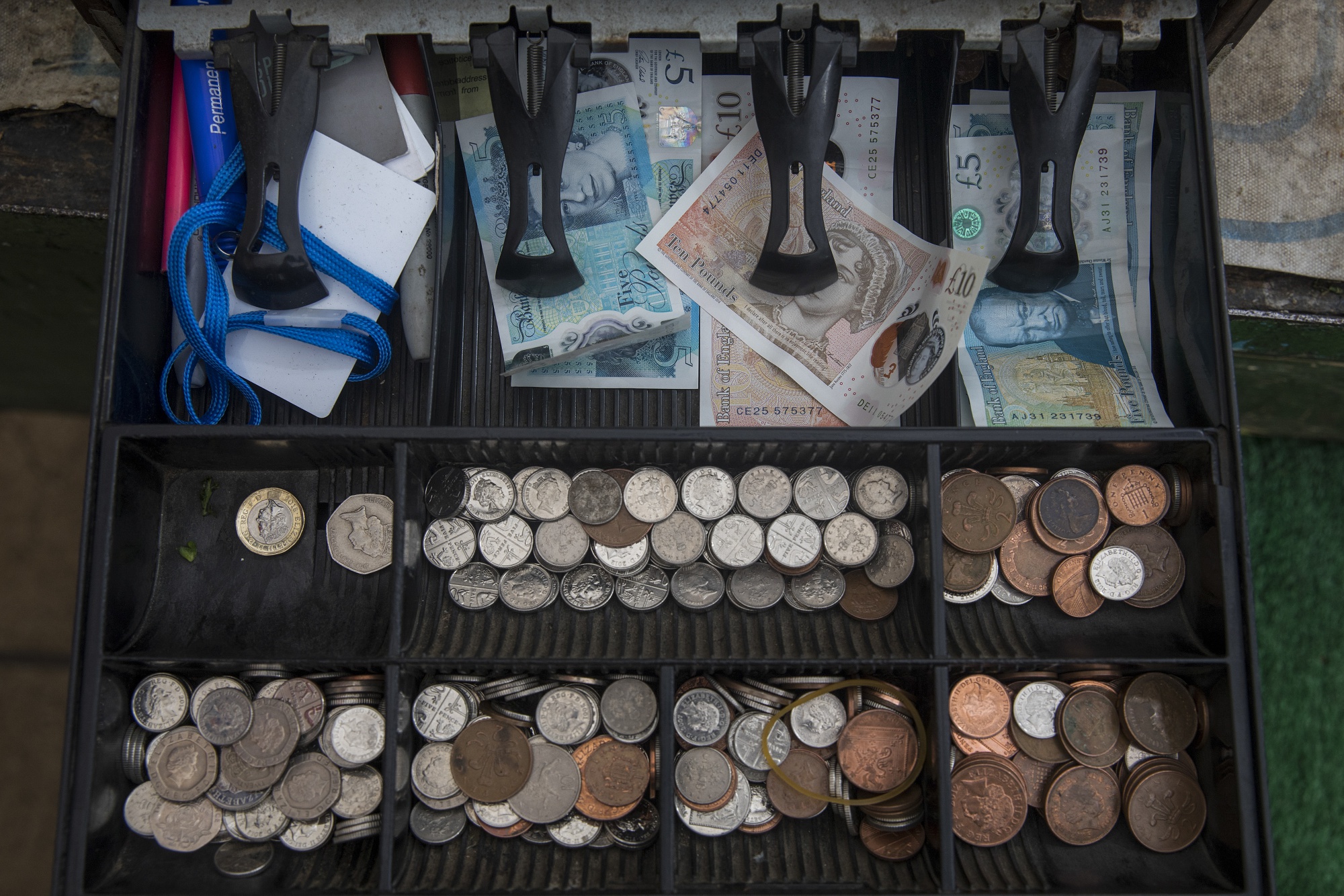 一个收银机里装着英镑纸币和硬币在伦敦。