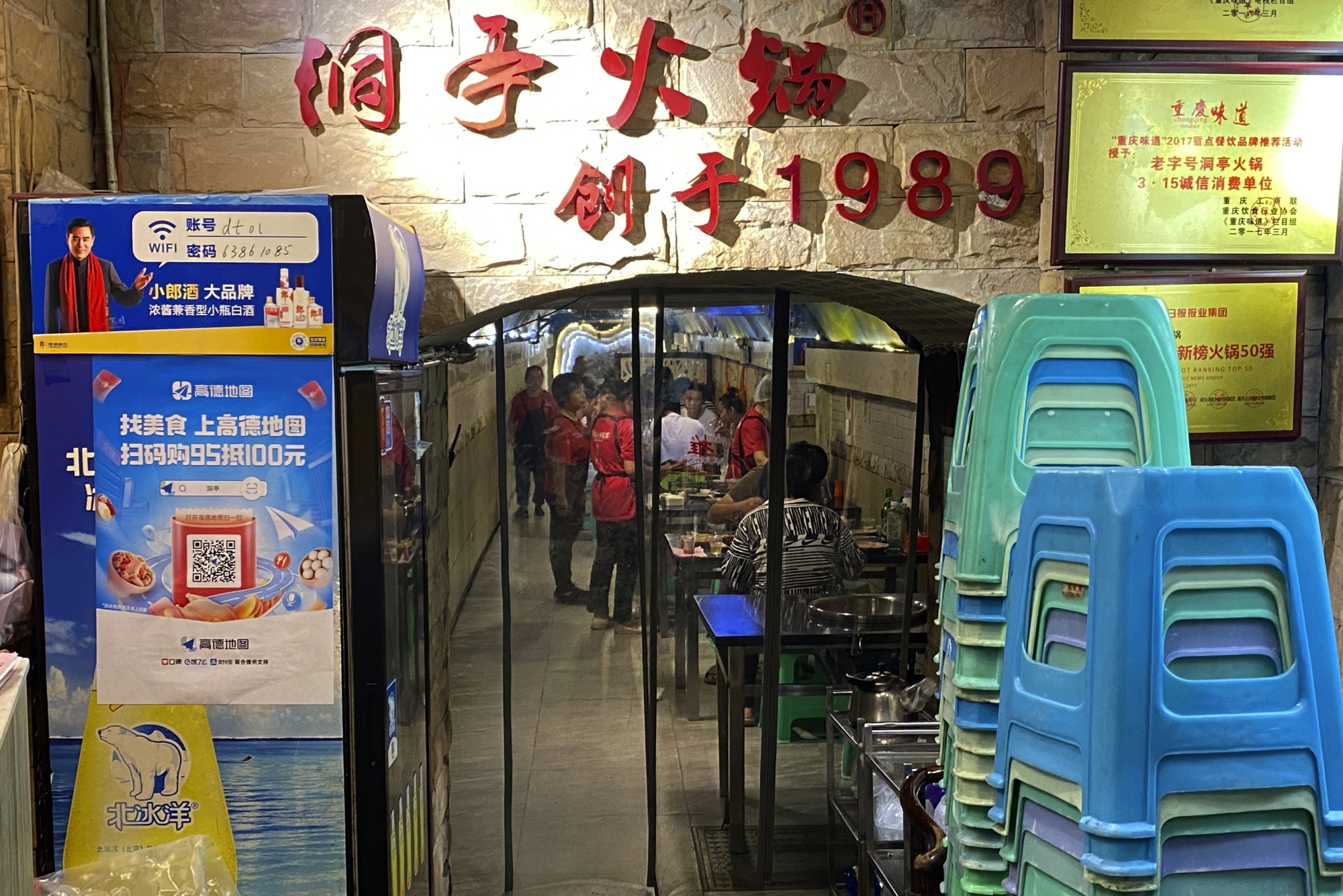顾客在中国西南部重庆市一个改建的二战时期防空洞内的火锅餐厅用餐,2022年8月20日星期六。重庆市被誉为中国四大“火炉”城市之一,以酷热的气候和辛辣的美食而闻名 - 尤其是其火锅,一种辛辣冒泡的桌上高汤,顾客可以将食物的小块放入其中烹饪食用。(AP图片/马克·谢菲尔拜恩)
