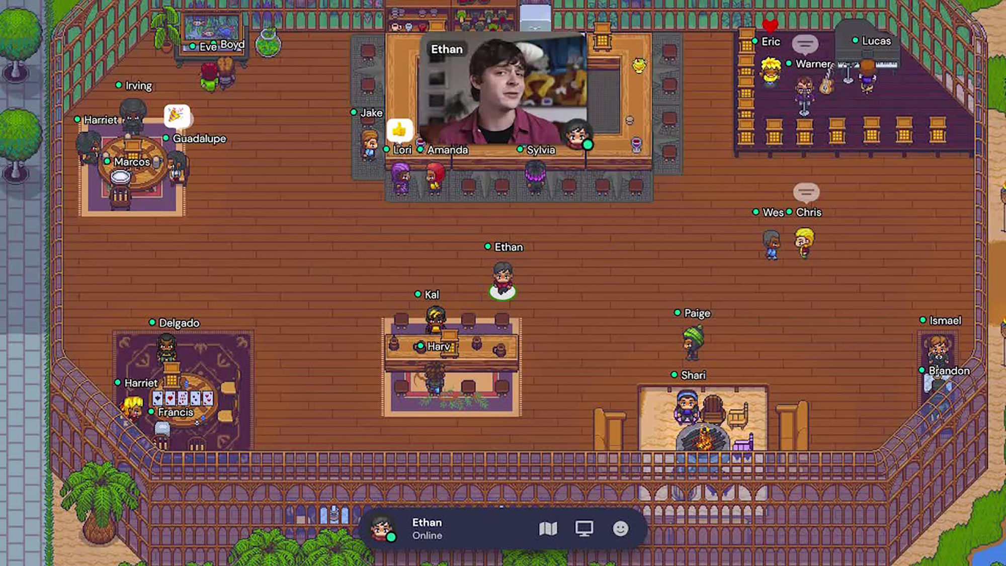 Gather的数字工作场所来源:Gather.town“想象一下,如果你可以在办公室而不必通勤,” Meta的扎克伯格在2021年10月的一次公告中说道,这标志着该公司对元宇宙的数十亿美元押注的启动。“你仍然会有那种存在感、共享的物理空间,那些让你一天愉快的偶然互动,所有这些都可以在任何地方访问。”