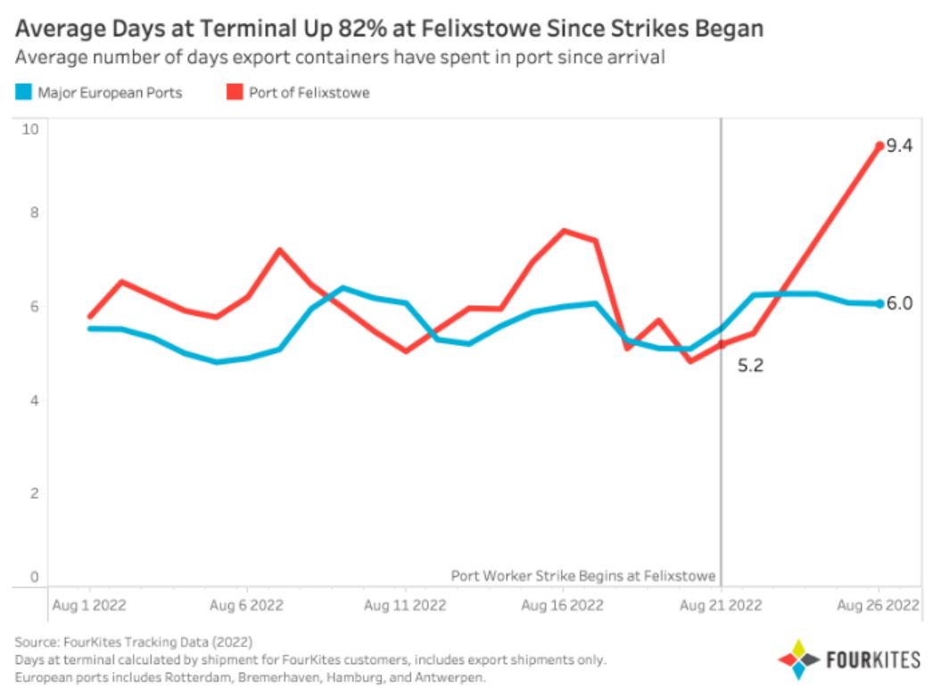 8月21日,罢工开始的那天,出口货物等待的平均天数为5.2天,但根据FourKites的数据,截至8月26日,这个数字已经达到了9.4天,增长了82%。相比之下,北欧最大港口出口货物的等待时间仅增加了9%。