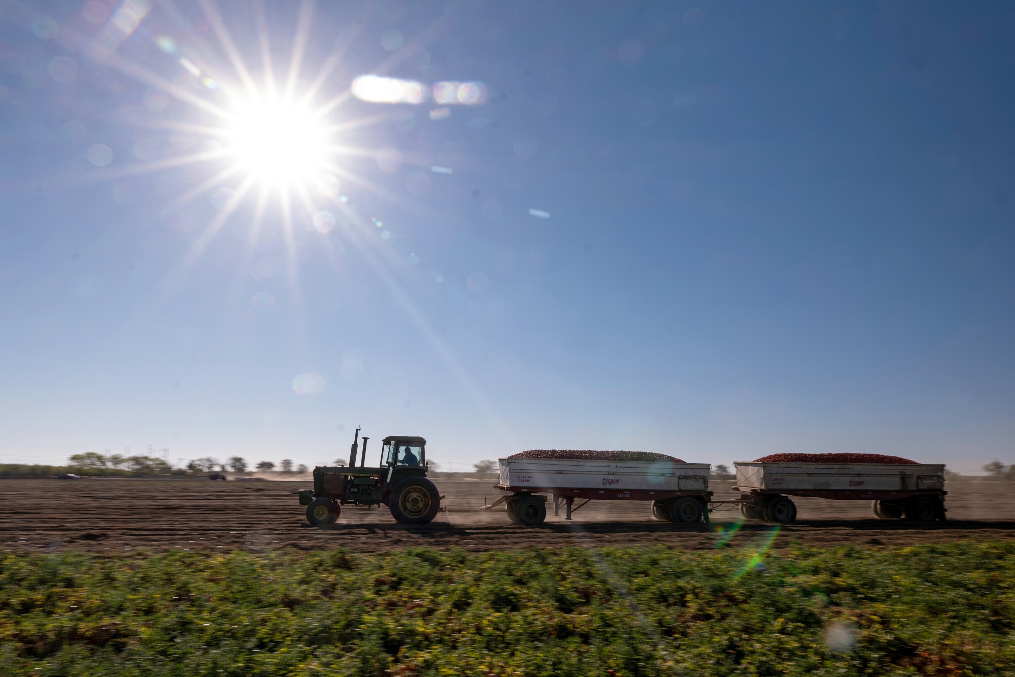 一名工人在加利福尼亚州温特斯(Winters)拉着装满番茄的拖车。
