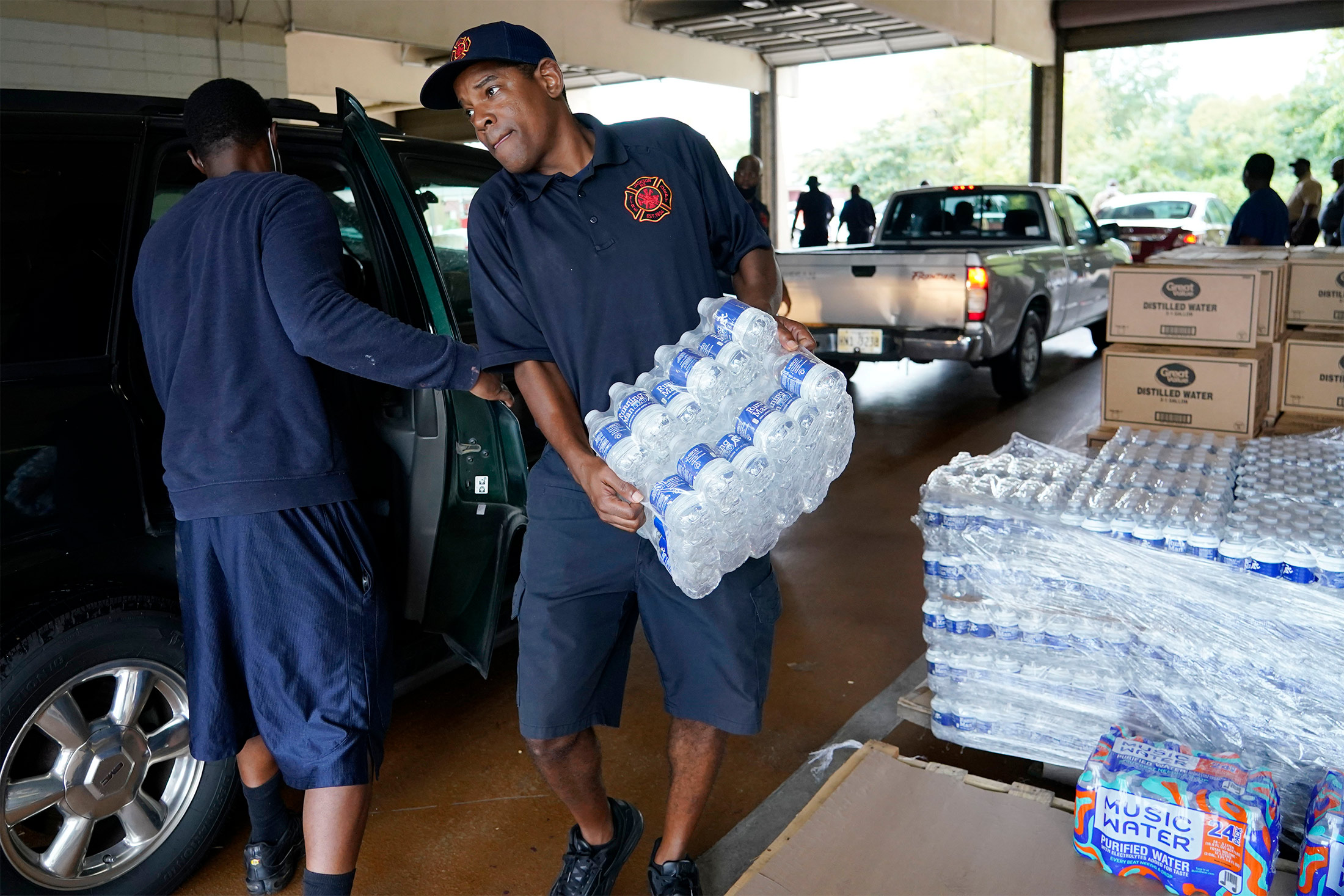 一名消防员在8月18日将瓶装水装入杰克逊市一名居民的车辆中。