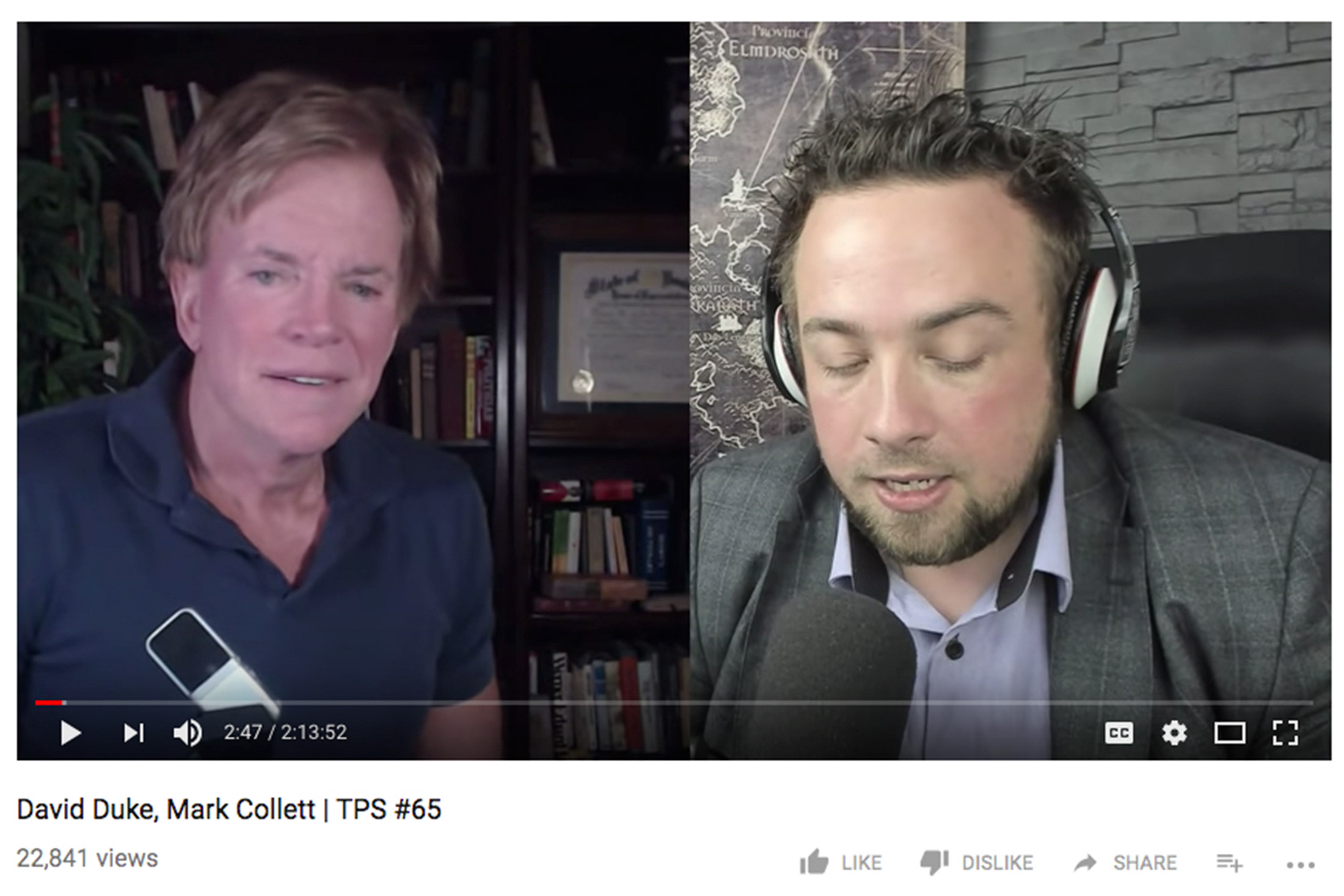 杜克(左)在2020年被删除的视频中。门格林于2016年离开了公司。 YouTube在广告抵制之后,开始采纳他的建议,从推荐中删除了数百万个有争议的视频。 然而,其他人看到在接下来的几年里极端内容的恶性蔓延。 巴尔丹帮助组织的2020年的演示突显了YouTube在内容管理上的双重标准。 一张幻灯片展示了来自已知伊斯兰恐怖组织或人物的剪辑截图,其中包括古兰经诵读或对美国的谴责,这些在2017年的规则变更后允许YouTube将其归类为极端内容。 所有这些视频都被删除了。