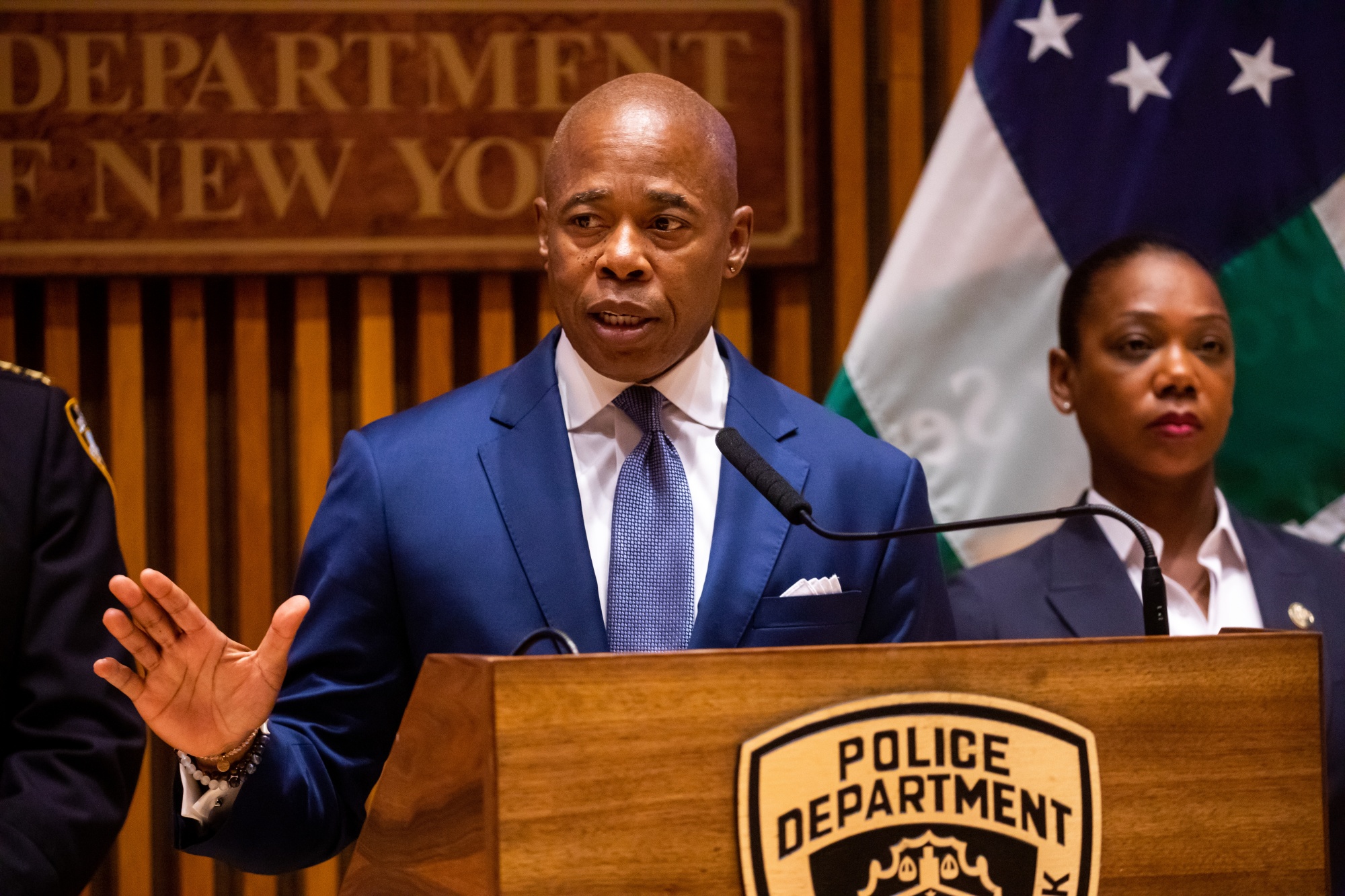 纽约市市长埃里克·亚当斯(Eric Adams)中间发言,纽约市警察局(NYPD)警察局长Keechant Sewell右边,在2022年8月3日星期三在美国纽约举行的新闻发布会上。