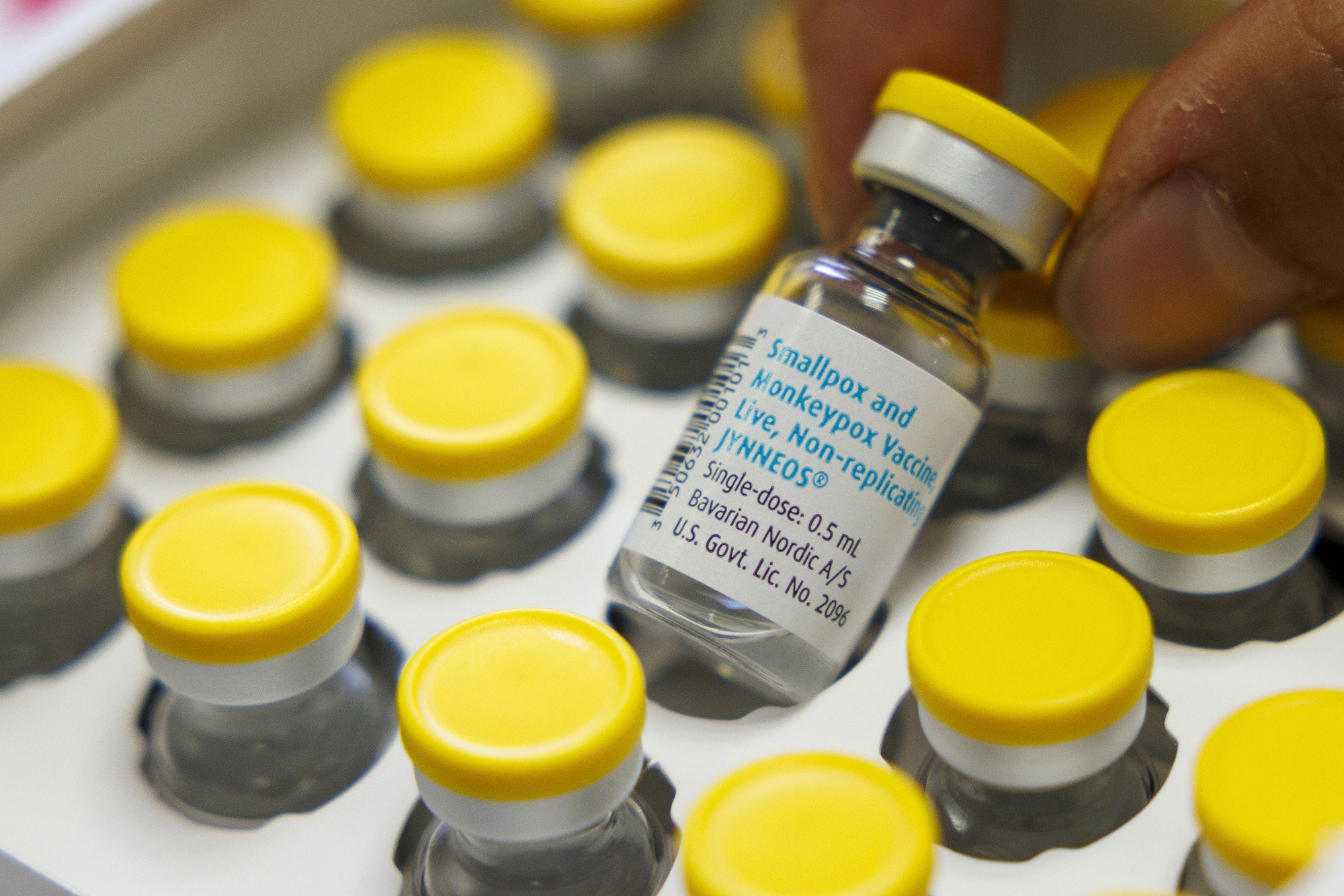 一名卫生工作者处理拜尔维亚诺迪克A/S金奥斯猴痘疫苗的小瓶。