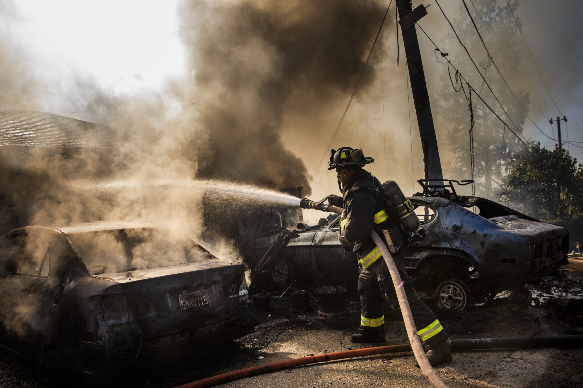 一名消防员在2020年10月扑灭了加利福尼亚州奥克兰蒙特克莱尔山区的一场建筑火灾。火灾的初步原因是发电机超负荷。太平洋煤气电力公司在风暴期间切断了该地区的电源,以防止活电线落入干燥的灌木丛中。