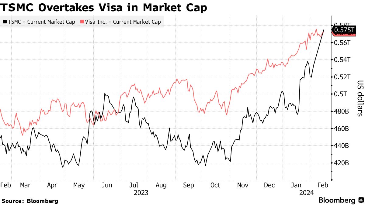 台湾最大的公司在农历新年假期结束后的第一个交易日飙升了7.9%,使其市值达到创纪录的5750亿美元。这足以超过Visa公司,成为全球第12大市值公司。摩根士丹利将这家芯片制造商的目标股价上调约9%后,TSMC一年多以来的最大涨幅出现了。