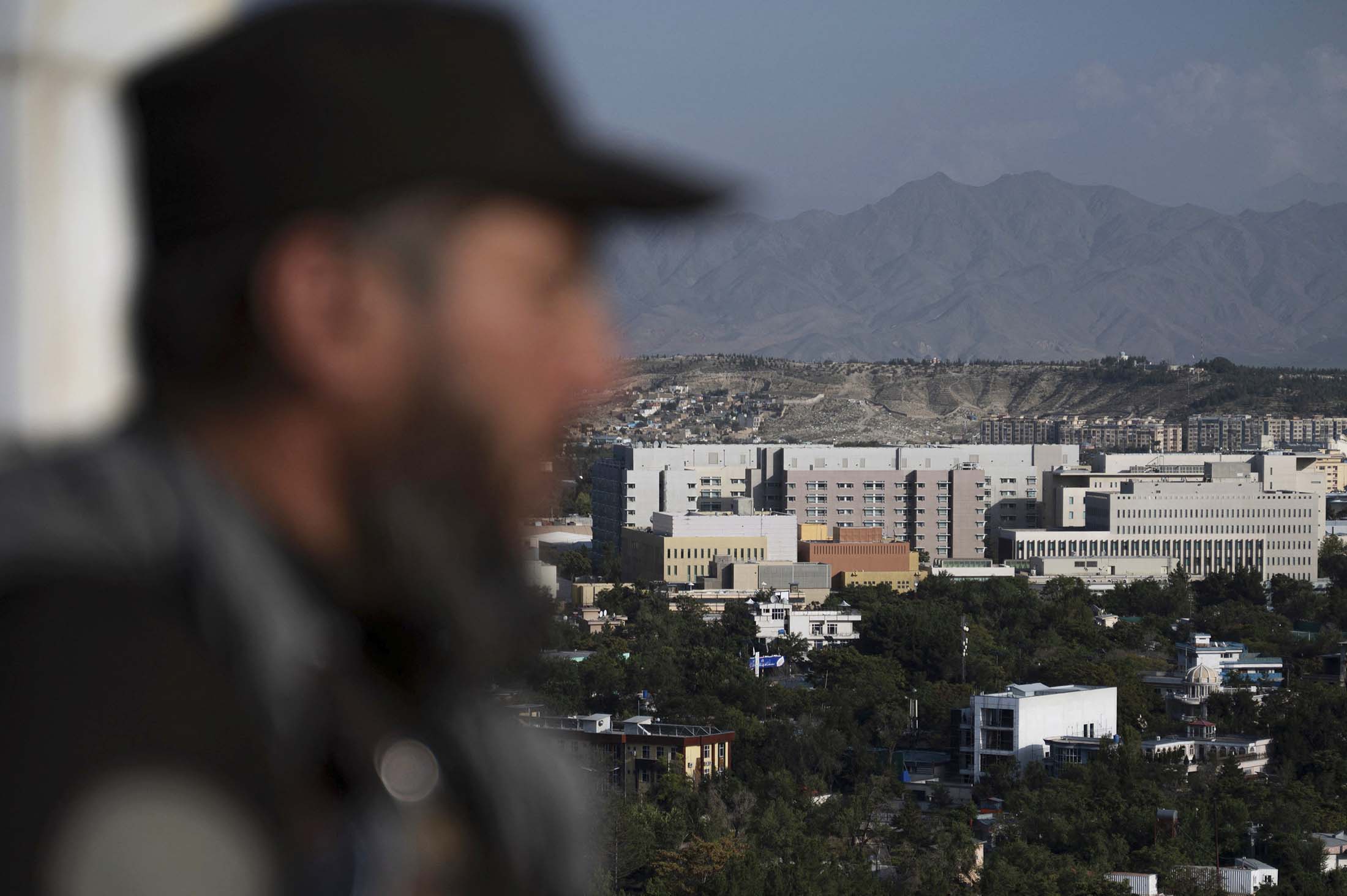 塔利班战士在喀布尔瓦齐尔·阿克巴尔汗山顶站岗,于8月30日。