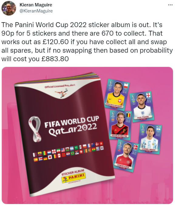 在2018年世界杯期间,英国卡迪夫大学的一位数学家计算出,一名球迷平均需要购买4832张贴纸才能完成贴纸册。一些熟练的交换可能会减少这个数字,但即便如此,全球各地的收藏家也无法幸免于通货膨胀的影响。
