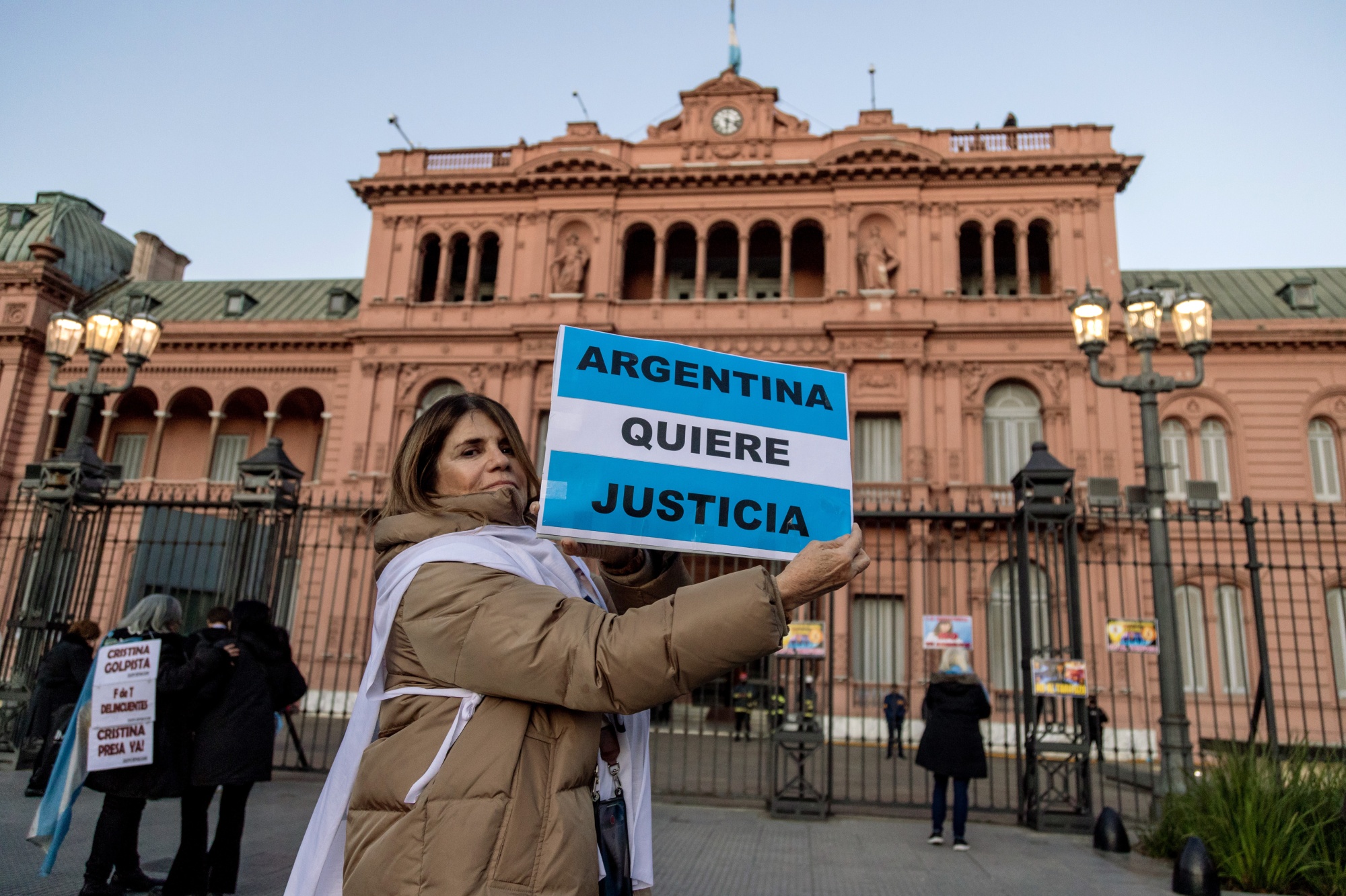 在8月18日,在布宜诺斯艾利斯的马约广场举行的反政府抗议活动中,持有“阿根廷要正义”的标语的示威者。