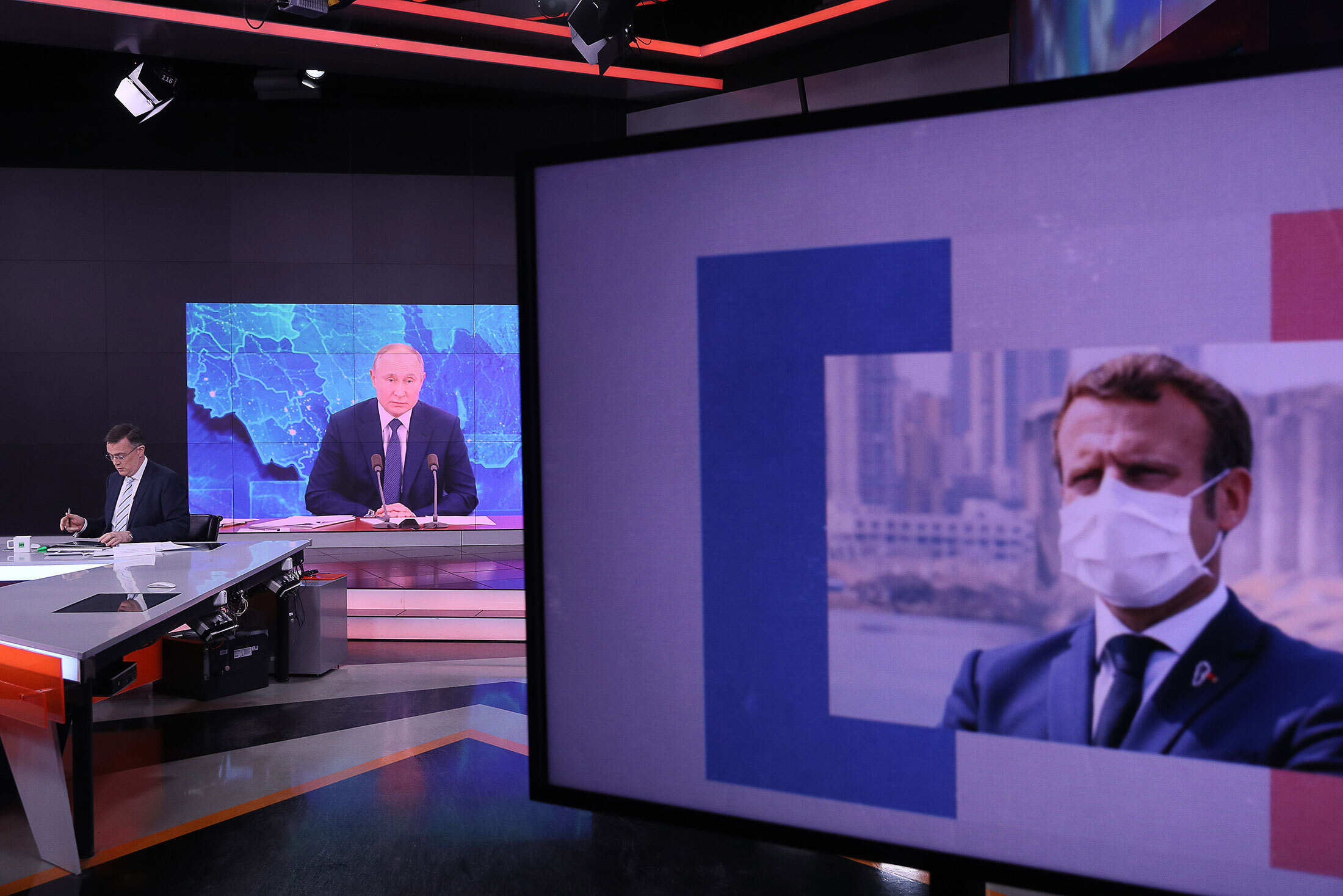 普京在2020年12月17日从RT工作室发表了他的年度新闻发布会。摄影师:亚历山大·谢尔巴克/塔斯社/祖玛新闻社在接下来的几年里,RT发现了大量机会来突出西方所谓的虚伪。2018年开始的法国黄马甲抗议活动,当时因汽油税引发愤怒的司机开始占领郊区环岛,几乎是这家网络的完美素材,表达了对建立反对立场的愤怒,但没有真正的政治议程。根据法国研究员Maxime Audinet引用的分析,RT法国发布了1034个关于这些示威活动的视频,观看次数达到了3000万次,比法国五家主要在线媒体制作的629个视频多25%。