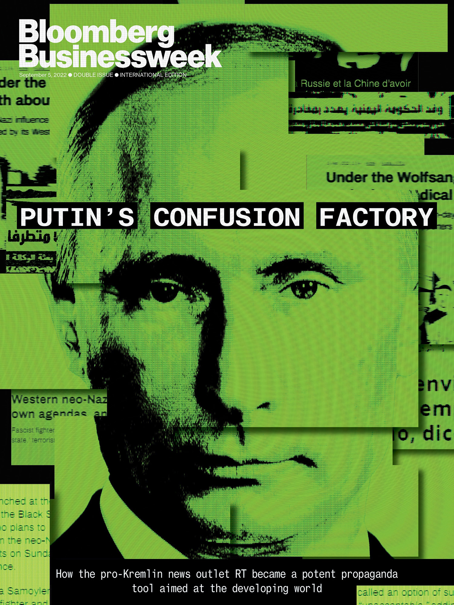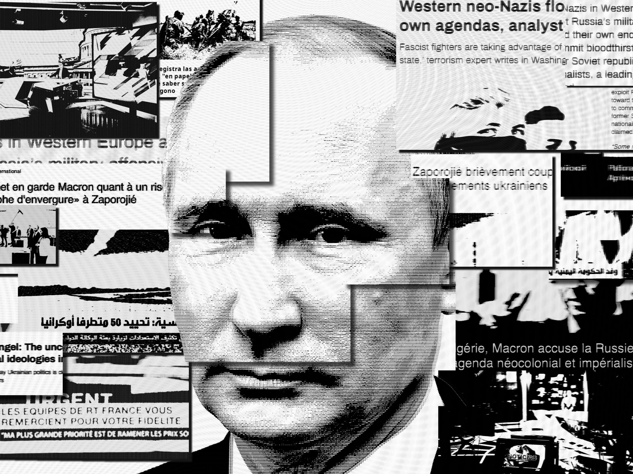 图片插图:731;摄影师:Jeremy Liebman/Trunk Archive(普京)现在是莫斯科的中午时分,RT,克里姆林宫24小时英语新闻频道,正在快速播放令人眼花缭乱的节目。乌克兰士兵正在放弃被围困的阿佐夫斯塔尔钢铁厂的阵地,RT称之为对基辅战争努力的致命打击。还有一则关于一名英国志愿者与乌克兰军队合作的警示故事,他表示自己被欺骗了。七国集团外长会议引发了一篇关于西方如何谴责俄罗斯军事行动但不谴责以色列的虚伪报道。新闻片段与夸张的脱口秀和迷你纪录片交替播出,比如快进法西斯主义,一部揭露乌克兰新纳粹的纪录片。