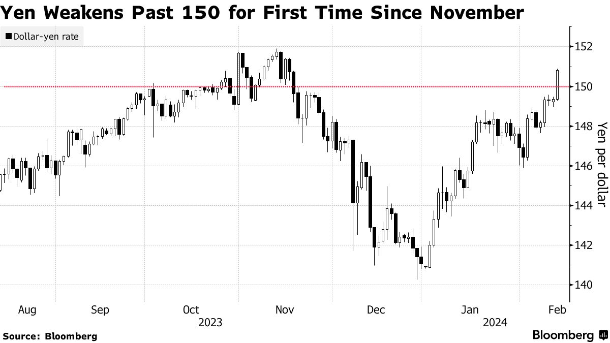 日元兑美元首次自11月以来跌破150,引发了日本官员数月来最强烈的反击,因为美国通胀高于预期,打消了对美联储提前降息的预期。