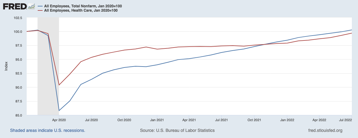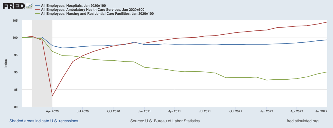 在疫情初期的冲击期间,该行业的就业下降幅度比其他行业小 — 餐馆空无一人的时候,医院却挤满了人。直到去年年底,医疗工作岗位的表现比整体劳动力市场更好。
